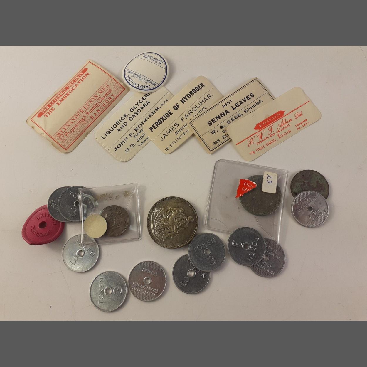 A small mixed collection of aluminium Transport tokens, a Haslemere Co-op token, a Papal medal and some vintage chemists bottle labels.