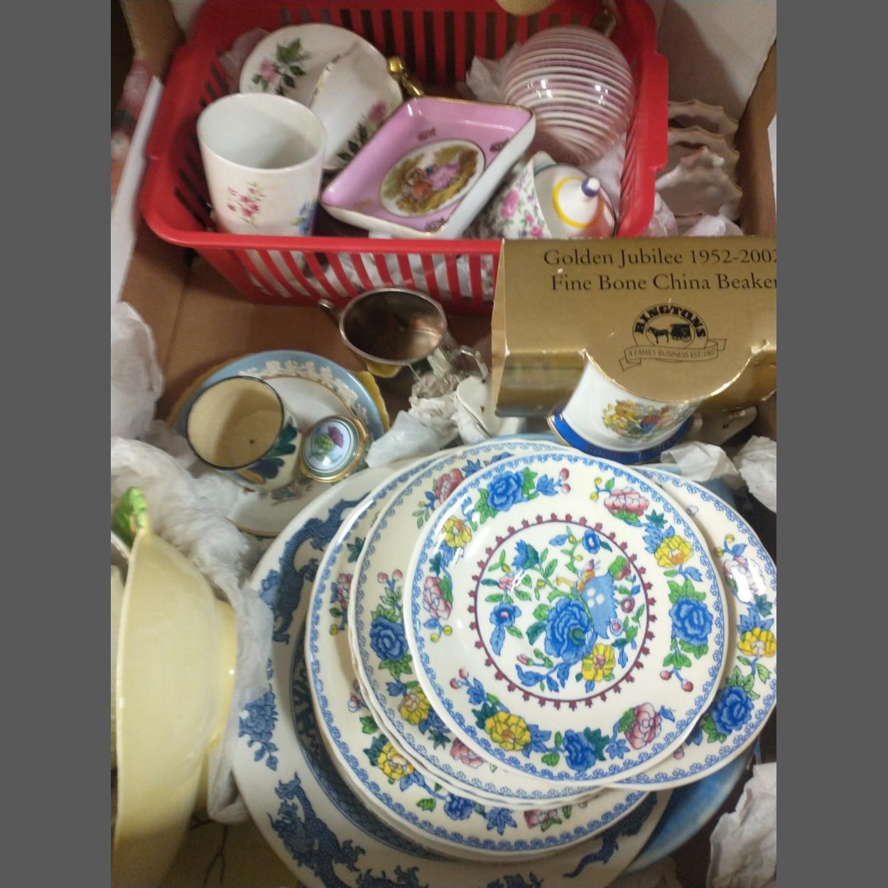 A mixed lot of mainly china to include a small ROBERT HERON beaker (5.5x5.5cm dia), a STAFFORDSHIRE ENAMELS pill box with thistle design, a small POOLE pottery mustard pot, MASON'S Regency crockery, WEDGWOOD Kutani dish (10cm dia) plus much, much more