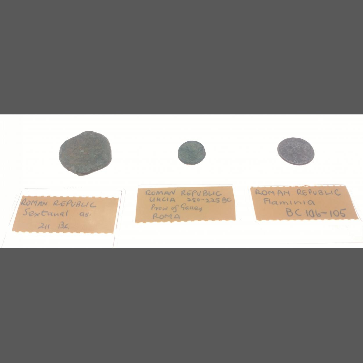 Three coins of the ROMAN REPUBLIC with interesting detail. One noted as FLAMINIA (106-105BC), another noted as UNCIA (250-225BC) and one showing the head of JANUS