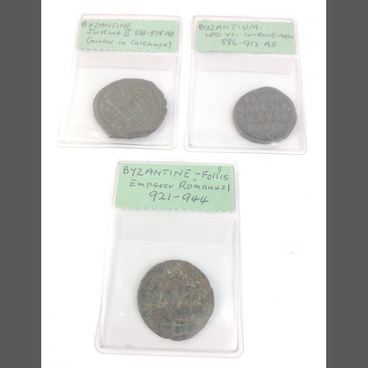 A collection of three BYZANTINE ancient coins to include Emperor ROMANUS first follis 7.4g approx, 26mm, LEO VI with beautiful detail 8.9g approx, 25mm, holed and also JUSTINE the second Carthage 13.4g approx, 30mm dia