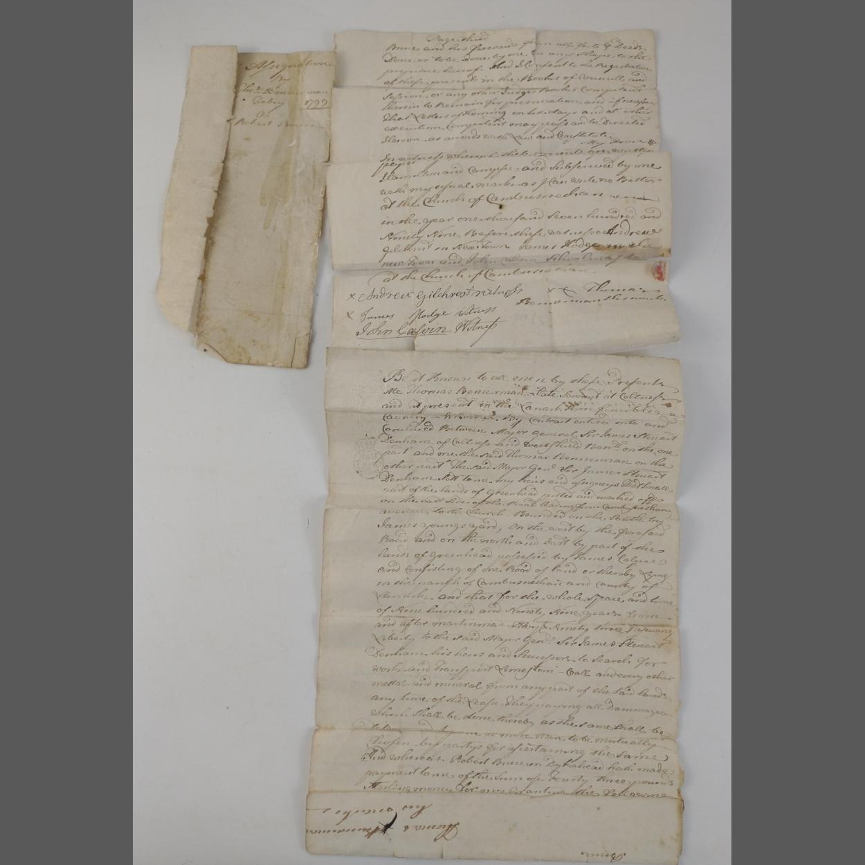 A piece of Scottish land history being an agreement between Thomas Bennerman and Major General Sir James Steuart Denham of Coltness and Westshield, dated 1799, document is in a fragile state