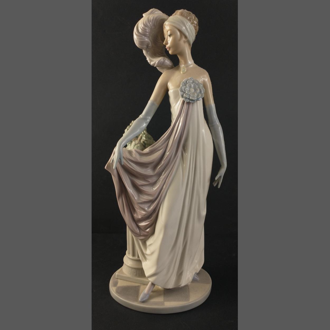 A beautiful LLADRO 1920s female figurine in flowing gown standing next to classical column and vase of greenery. Handmade in delicate colours. No.: C-8 JU. Approx. 34cm in height. In excellent condition.