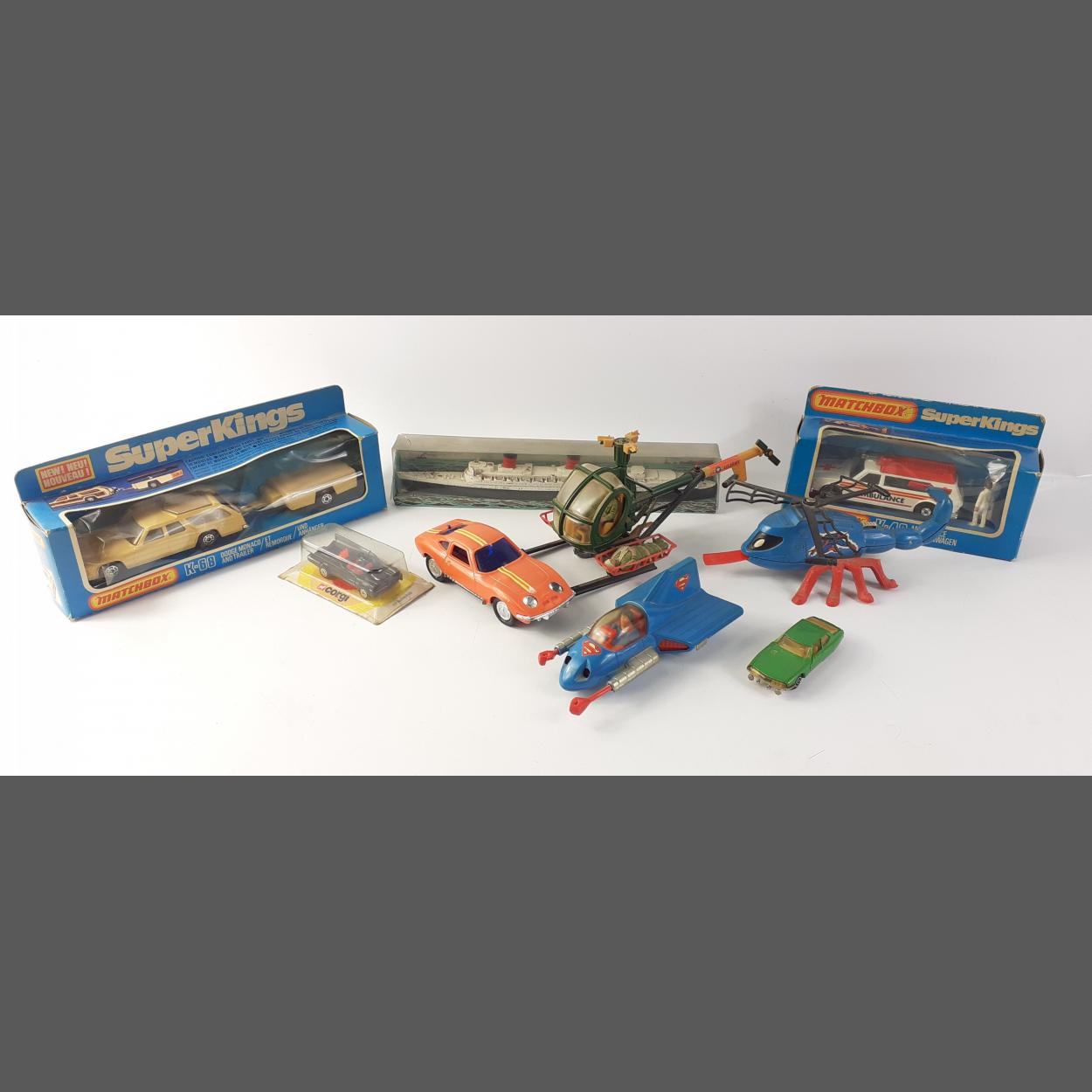 CARS AND BOATS AND HELICOPTERS! A VINTAGE collection of MATCHBOX, CORGI model transporters to include a Matchbox K-68 Dodge Monaco and trailer in original box, a Matchbox K-49 Ambulance in original box, a Corgi 69 Batmobile in original box, an unboxed made in Hong Kong plastic Opel GT, an unboxed Majorette Citroen Maserati.SM., an unboxed U.S. Army helicopter an unboxed Corgi Spiderman helicopter, an unboxed Corgi Supermobile (1979) along with a R.M.S. Queen Elizabeth M702 ship in its original box.