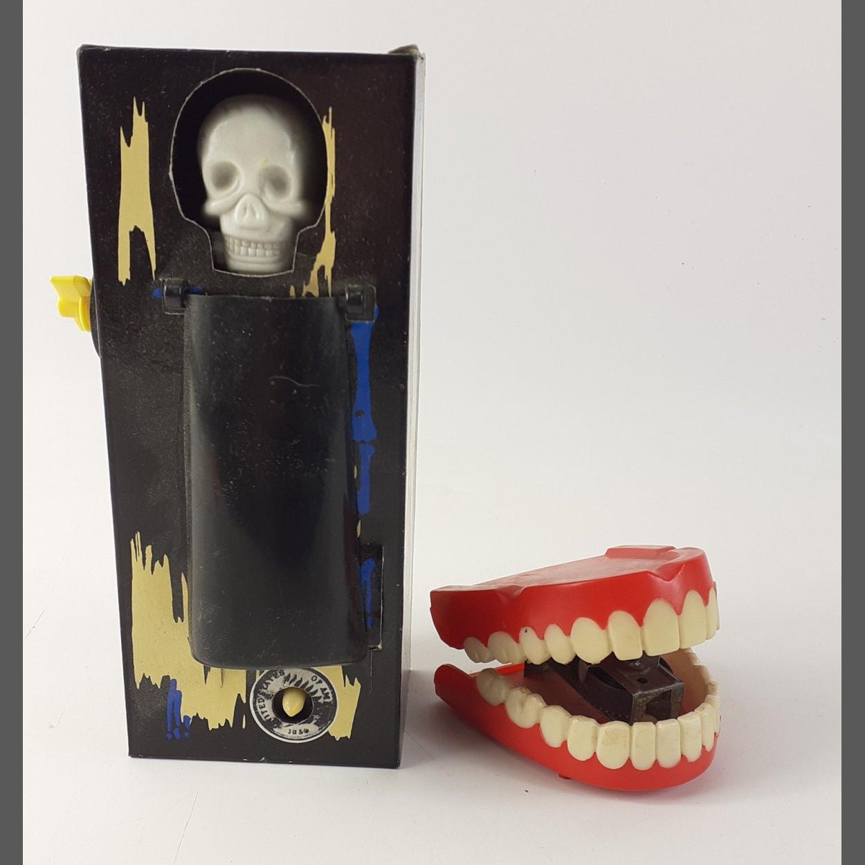HALLOWEEN'S AROUND THE CORNER! A perfect combination of VINTAGE HALLOWEEN memorabilia to include a pair of GNASHING TEETH (missing key) and a - "You can't take it with you -but-you can-try" - COFFIN BANK in working order.