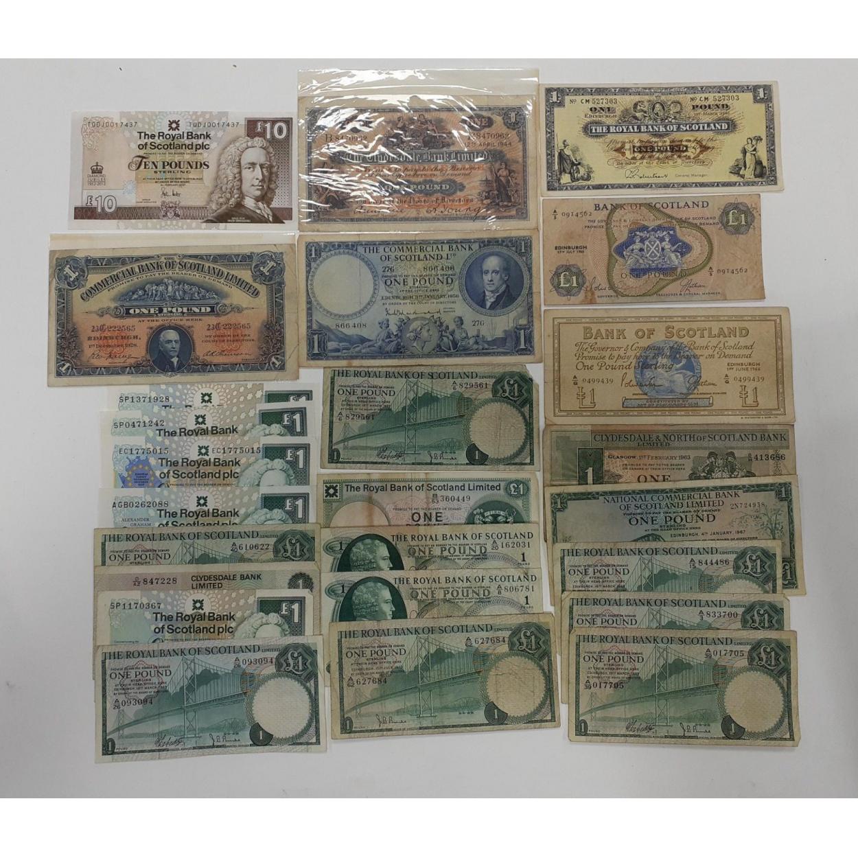 A super collection of SCOTTISH banknotes to include 1928 Commercial Bank £1, 1944 Clydesdale £1, 1956 COMMERCIAL BANK £1, RBS 2012 Diamond Jubilee and a selection of others. Twenty five notes in total with a face value of £34. All notes are in a worn condition.