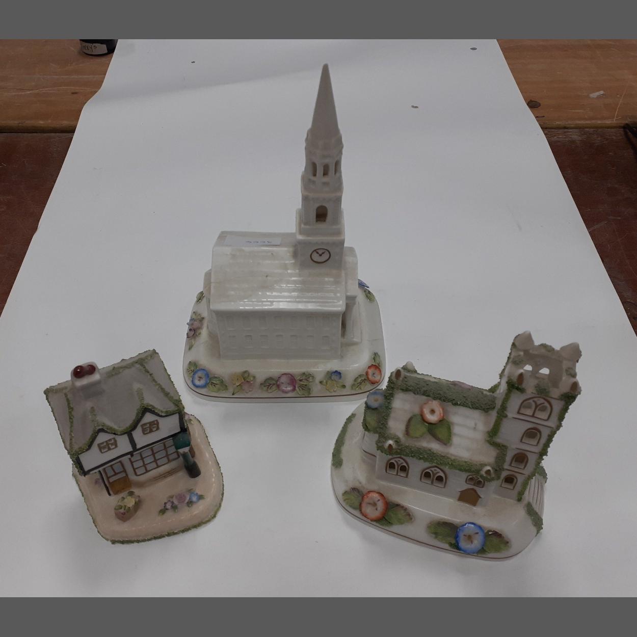 A set of 3 COALPORT fine bone china items to include "The American Church" approx. L14ckm x W11.5cm x H23cm. (Has damage / repairs). Together with "Village Church" approx. L13cm x W9cm x H14cm and "The Old Curiosity Shop" approx. L8cm x W9cm x H13cm.