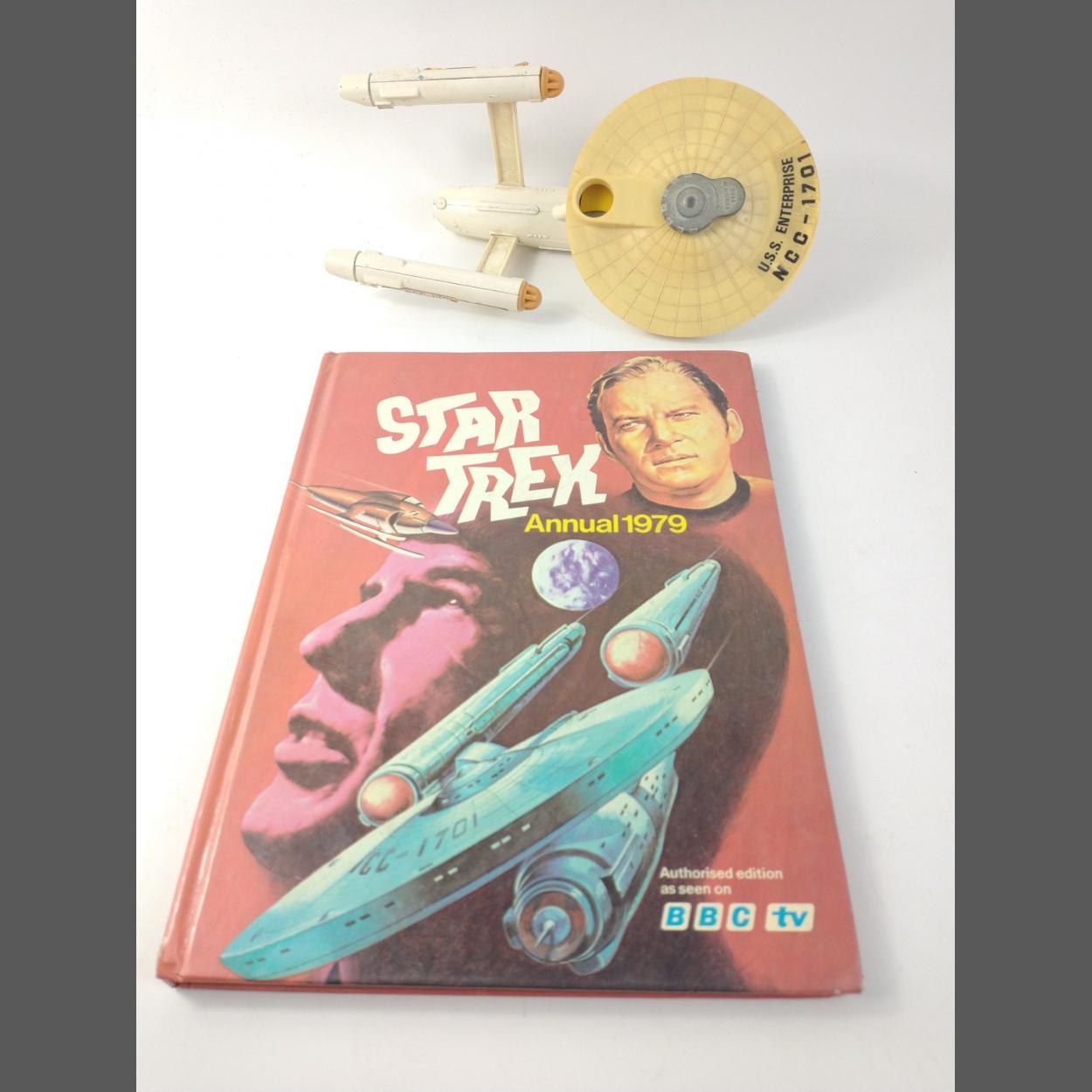 For all STAR TREK FUNDIES! A DINKY TOYS 1976 model of "U.S.S. ENTERPRISE". Approx. L23cm x W12cm x H8.5cm. Used condition. Together with a STAR TREK ANNUAL 1979. Used condition.