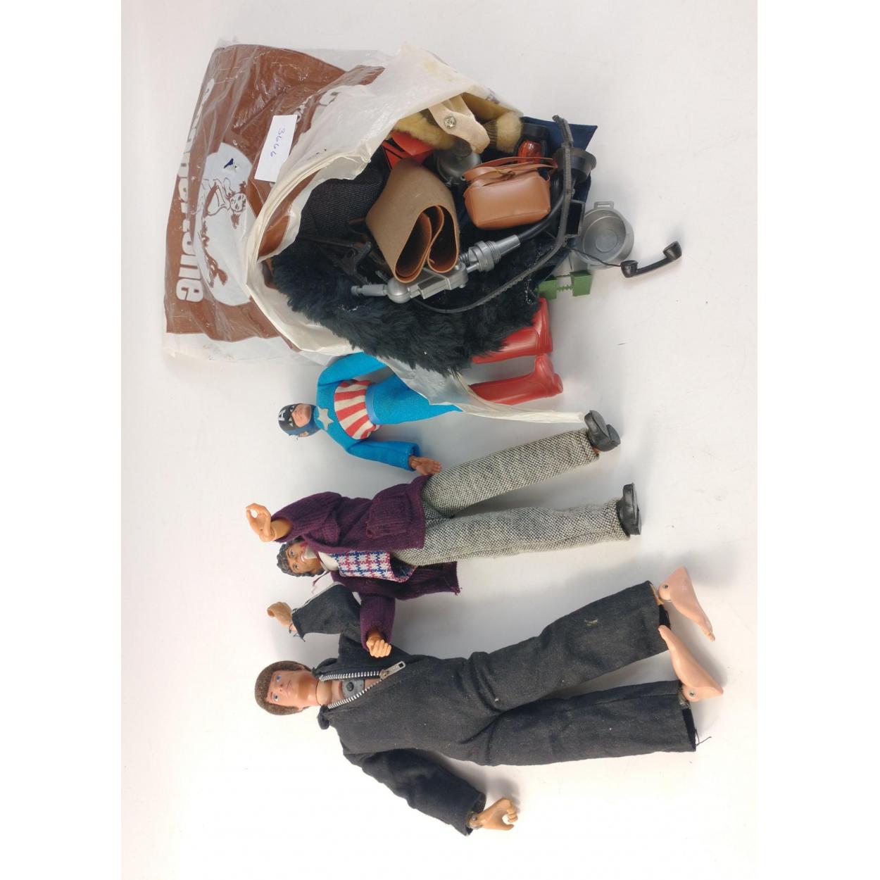 A CHILDHOOD TOY FAVOURITE! A VINTAGE STANDARD ACTION MAN with a bag of assorted clothing and equipment. Together with a DR. WHO (Tom Baker) figure and a CAPTAIN AMERICA figure. In used but good condition.
