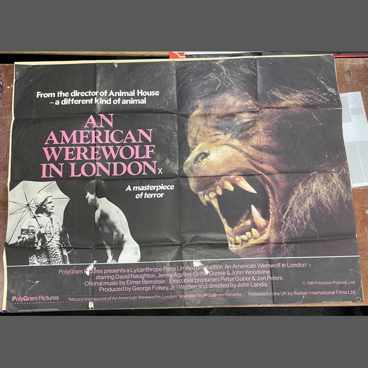 1982 AN AMERICAN WEREWOLF IN LONDON hand written dated verso 14/3/82? large wall poster 40" x 30" dimensions approx with a small V shaped tear bottom left hand corner 3cm approx, a small historical tear at the top edge LHS and a sellotape 'lifting-off' mark middle of credits and another LHS in pink font, and a small historical tear 2.5cm bottom LH corner - and all the usual folds - this poster is stated 1981 Polygram Pictures Ltd