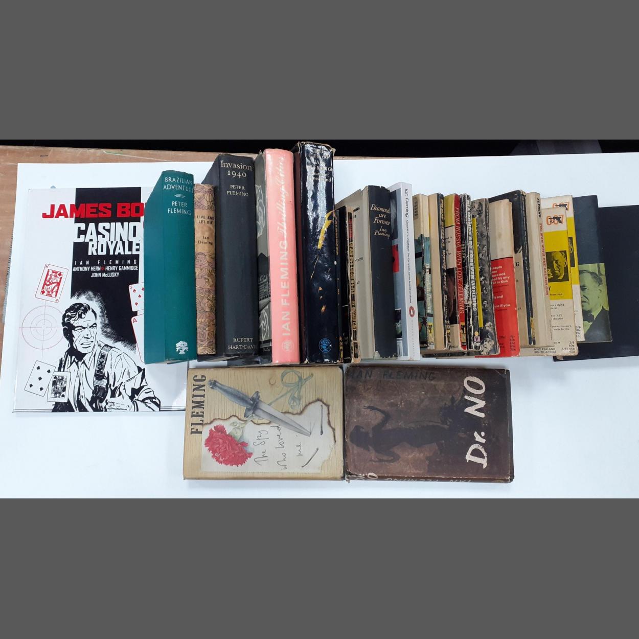 A collection of early edition paperback copies of JAMES BOND titles to include Casino Royale, Thunderball, Diamonds are Forever (1965 and1971), From Russia with Love (1959 and 1965), The Spy who Loved Me, Goldfinger, The Man with the Golden Gun, Octopussy, Live and Let Die, Moonraker, The Man with the Golden Gun. Condition readable but worn. Plus other IAN FLEMING connected works etc