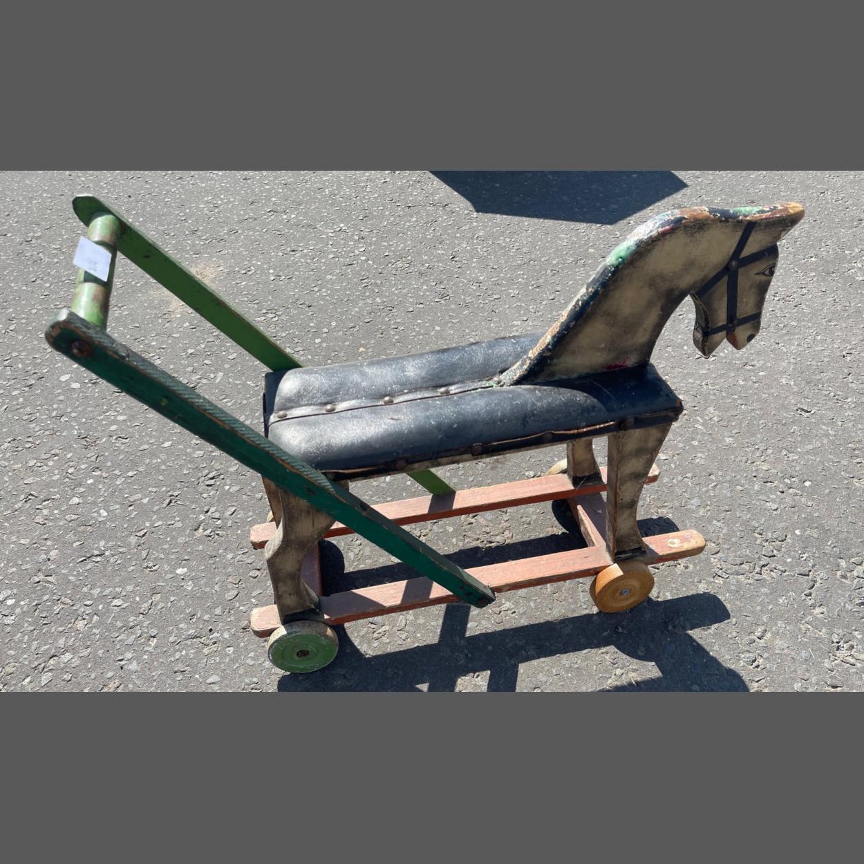 An ANTIQUE childs play horse on wheels - fabulous patina - dimensions height 16" x 21" length