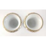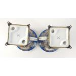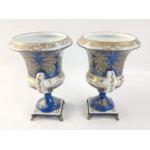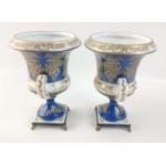 A pair of twin-handled pedestal urns with metallic feet in blue with gilt highlights each standing approx 17cm high with a pastoral scene, maker's mark of crossed swords to base, no visible damage