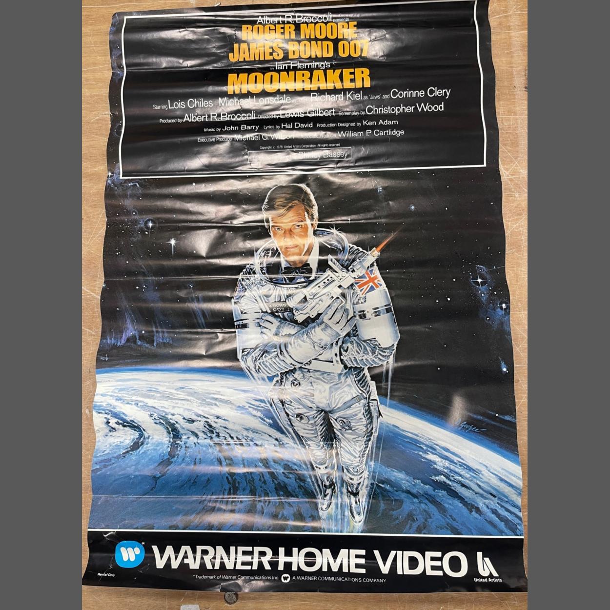 ROGER MOORE as JAMES BOND in MOONRAKER Warner Communications Company Warner Home Video Copyright 1983 wall poster in good condition, however the poster has been oddly-rolled-up causing a ripple effect when photographing it - once framed behind glass this will look great!