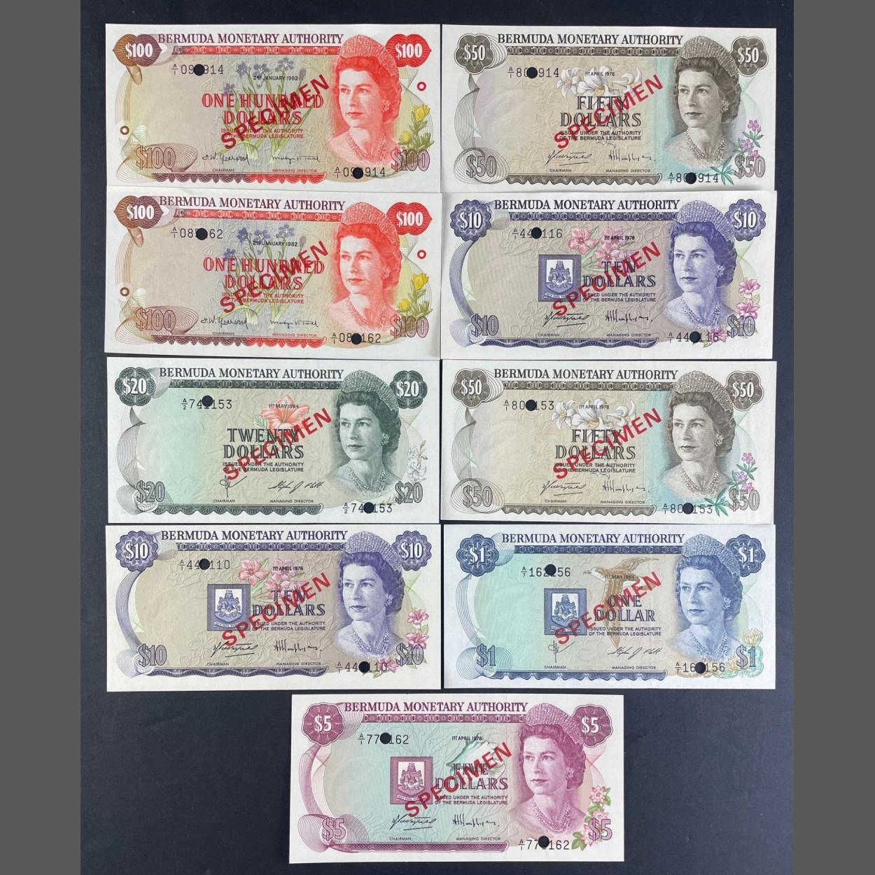 BERMUDA Banknotes. A full SPECIMEN set of six notes up to $100 Dollars. Also a SPECIMEN set of three up to £100 Dollars. All excellent.