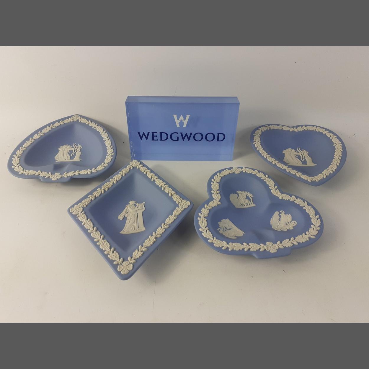 WEDGWOOD A very attractive little collection of four Jasperware trinket dishes with a retailer's display acrylic block. All in good order.
