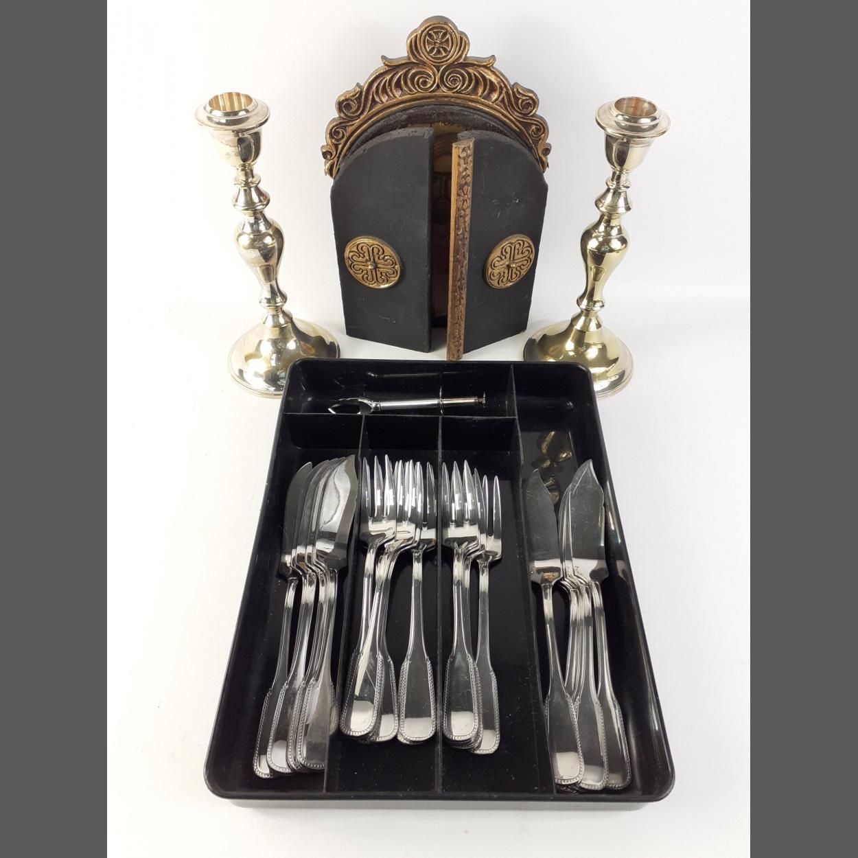 A small mixed box to include 11 fish forks and 12 fish knives, a pair of candlesticks 22cm approx and a Greek triptych 25cm high x 32cm wide when open and a pickle picker