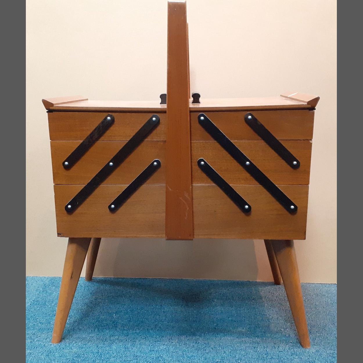 A wooden three tier cantilever sewing box on legs, jammed full of sewing goodies including a lucky horseshoe, pins, ribbons and a whole host more