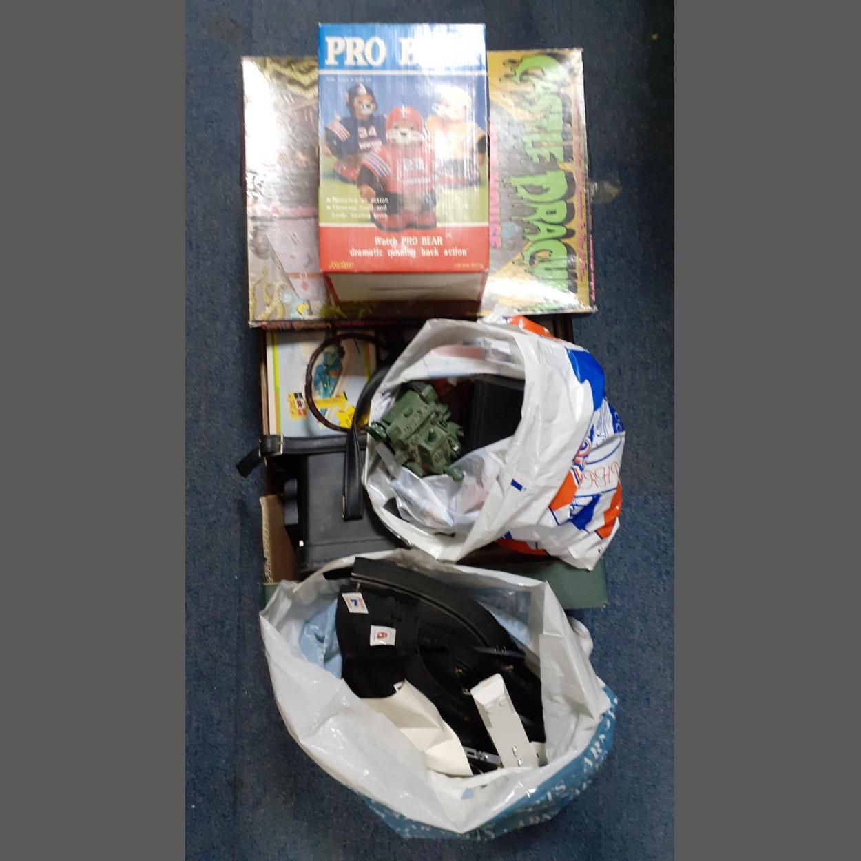 A mixed box to include a microscope with slides, model train set, a plaited leather whip approx 200cm long, basket ball game, polaroid camera, various model figures, etc