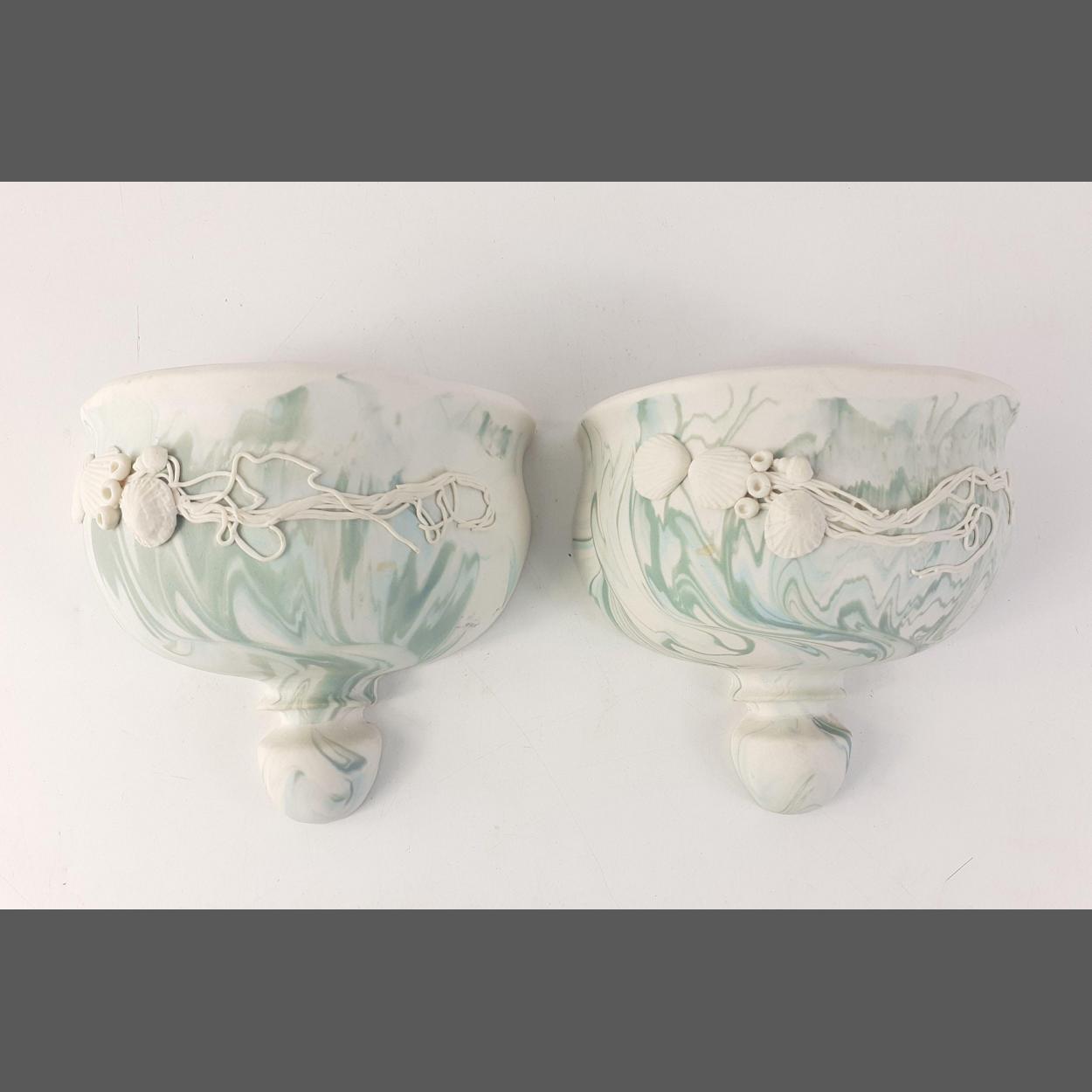 A pair of MARGARET MACDONALD CERAMICS (Made in Scotland) small classic-style wall planters in delicate cream/light green colours with shell decorations measuring approx. L14cm x W6.5cm x H13cm. In very good condition.
