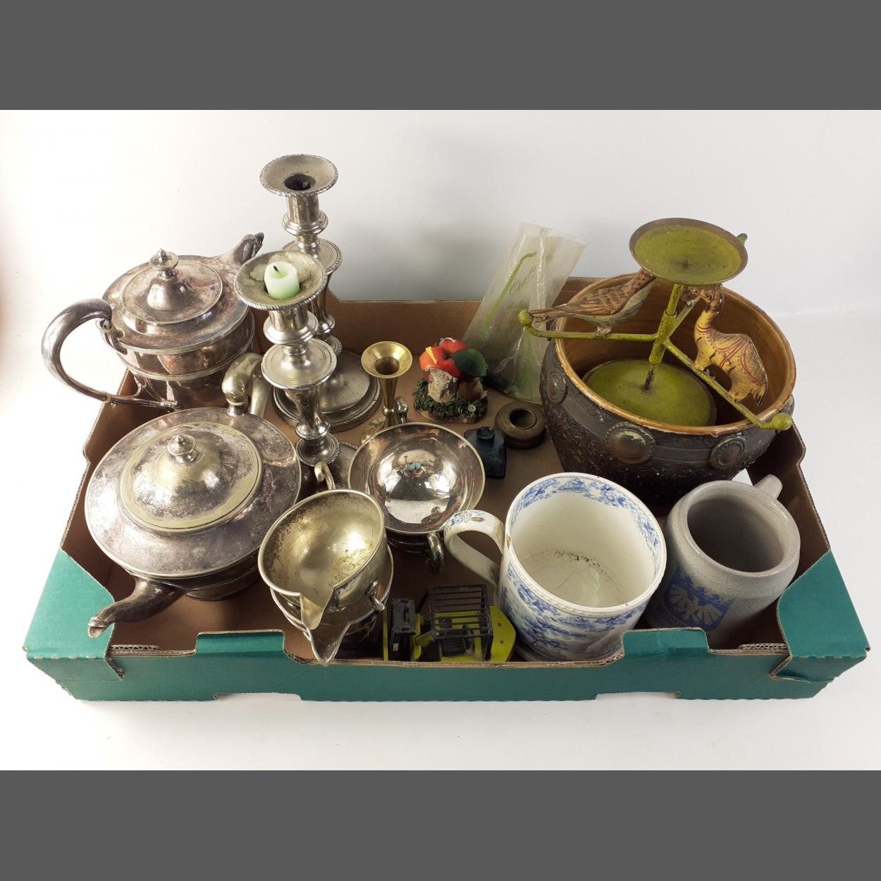 A mixed lot to include a broken Derby figurine, a GOVANWARE pot, various EPNS items, a Beer Stein, a pretty candle stand with animals and others.