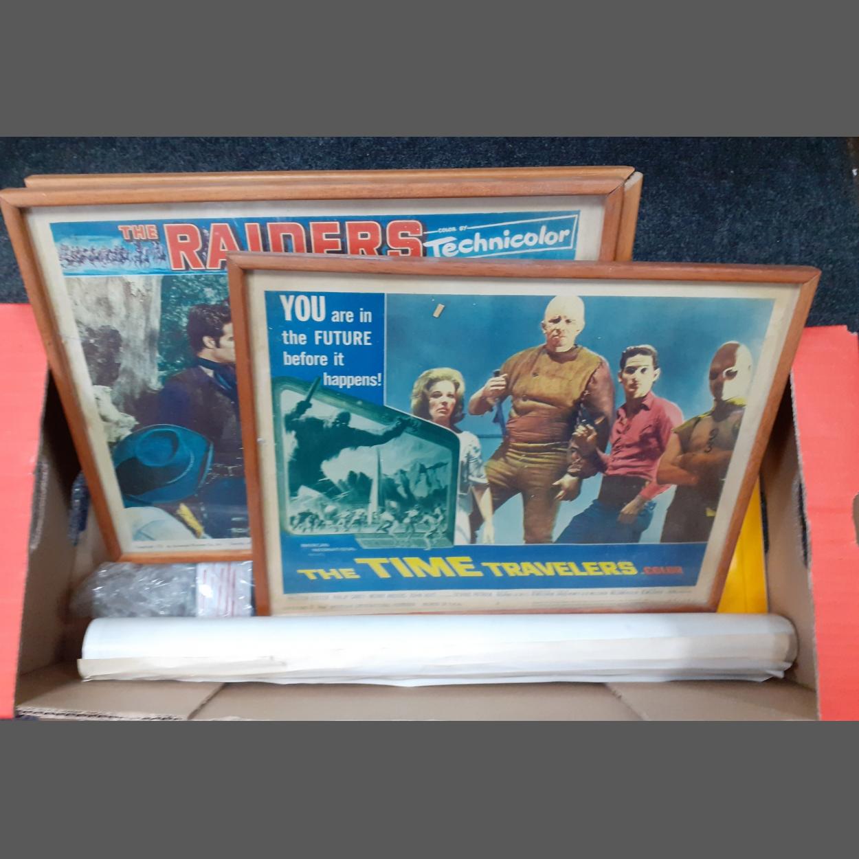 A box of movie memorabilia to include a set of 77 SUPERMAN bubble gum trading cards, 3 framed lobby cards including INDESTRUCTIBLE MAN (1956), THE RAIDERS (1952), and THE TIME TRAVELERS (1964), a script for a LAUREL AND HARDY sketch - Laurel and Hardy Visit London 1932, a 1993 calendar of spectacular posters from MCA universal blockbusters including Jaws, Back to the Future, E.T. etc, various cards