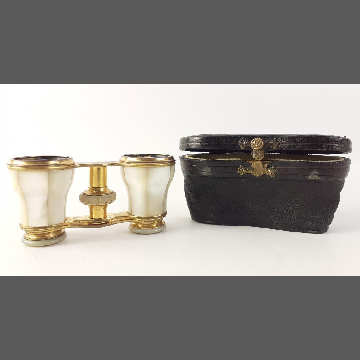 An antique pair of mother of pearl opera glasses by C ARMAND made for the GRAND HOTEL, PARIS in a leather case