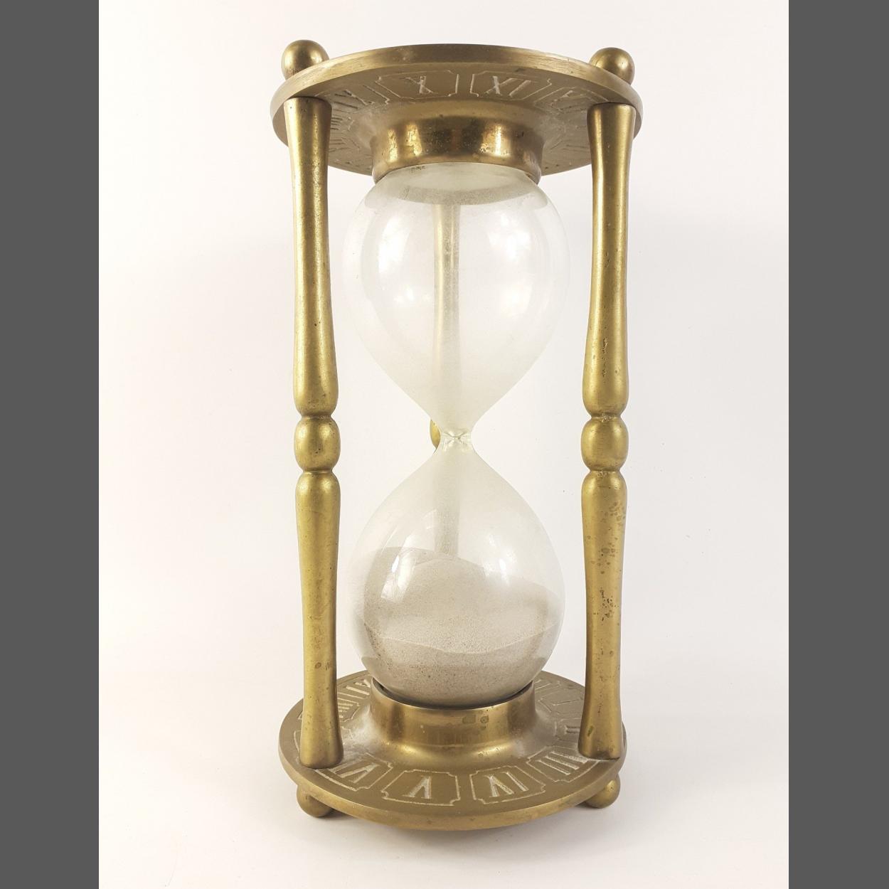 The sands of time. A solid brass hourglass sand timer. Father time and inscribed numerals throughout. A lovely display piece. 24cm tall.