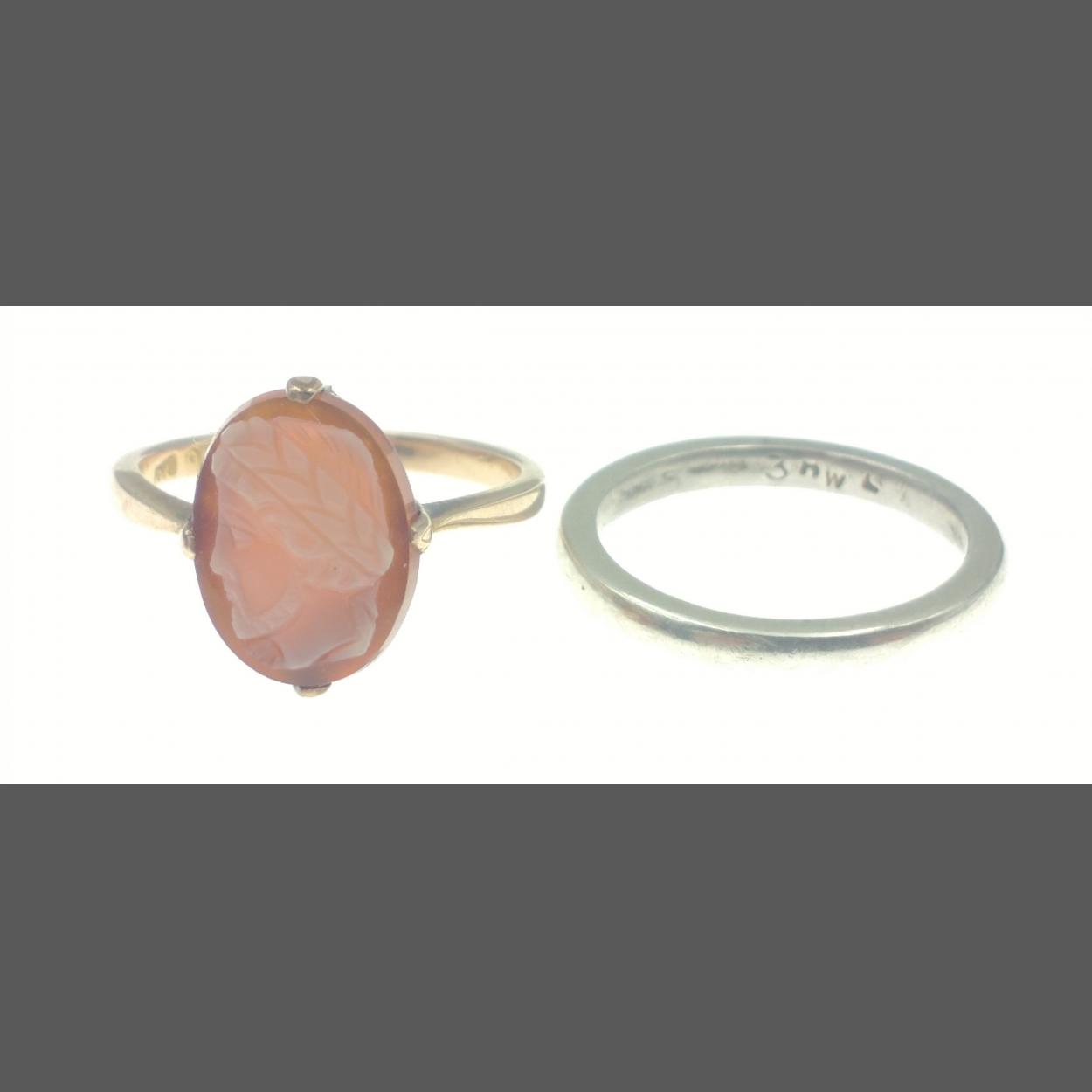 A 9C stamped ring with red stone carved cameo of a Greek god style head . Gross weight 2.6g approx. Ring size M Includes one other white metal band 2.2g approx with indistict marks.