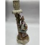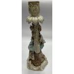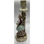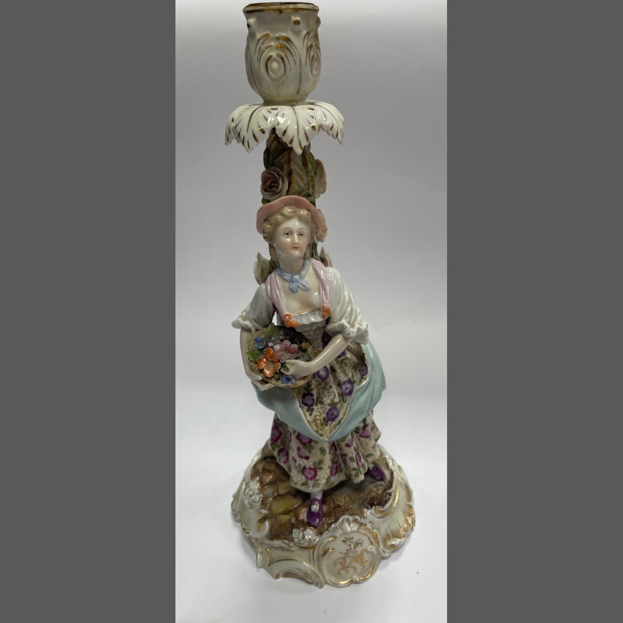 A c1900 DRESDEN over-glazed blue mark porcelain candle holder depicting a young maid flower-seller - no chips or marks apparent or any signs of damage repair - dimension height 28cm approx