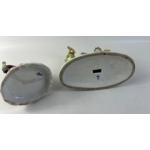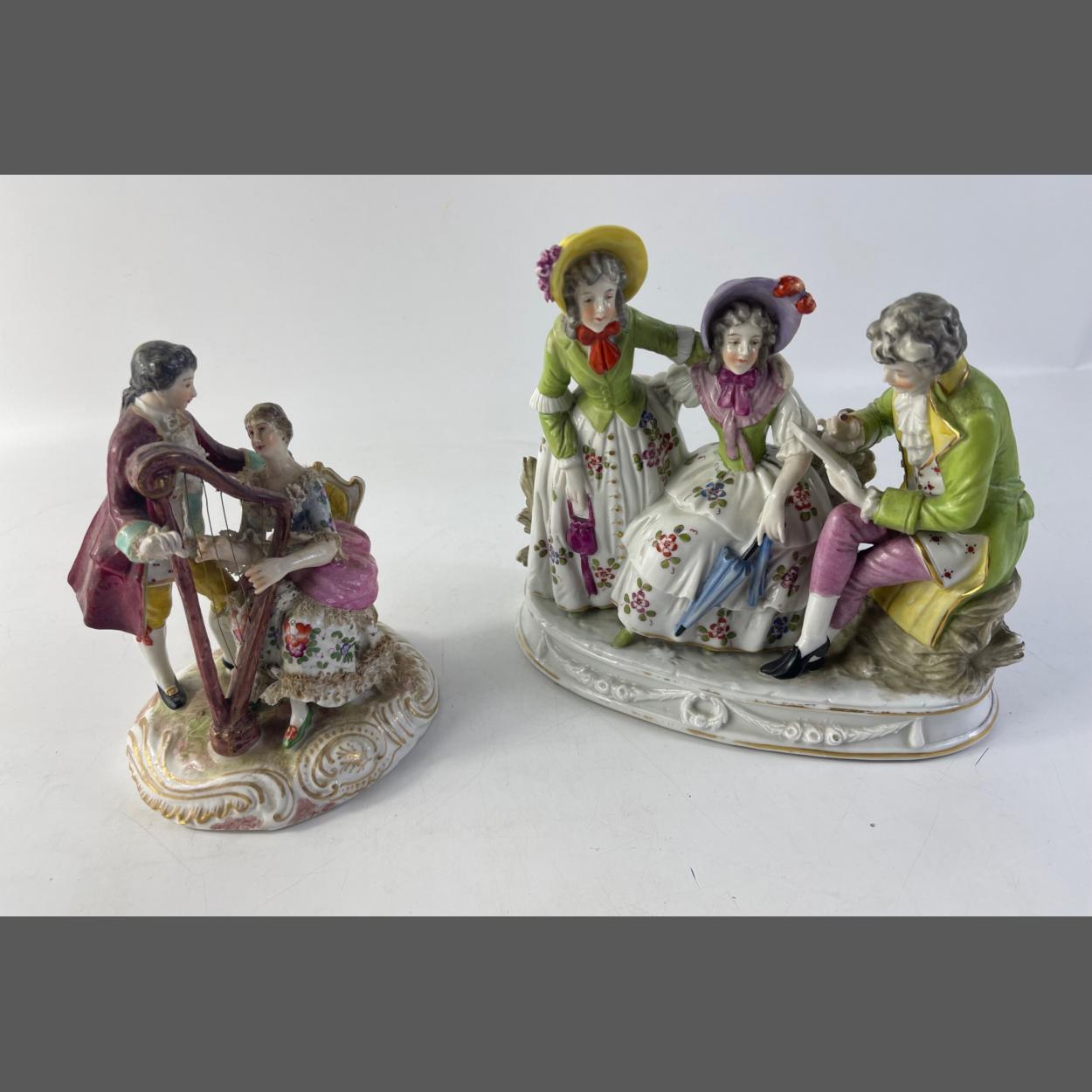 c19th century Capodimonte figurine set of two ladies and a sitting gentleman in period dress along with a blue stamped Capodimonte blue over glazed stamp - dimensions 19cm x 22cm width approx, all looks intact with no fingers missing etc - a nice example! with a German late 19th century porcelain loving couple playing a harp - dimensions 12cm width x 17cm height approx