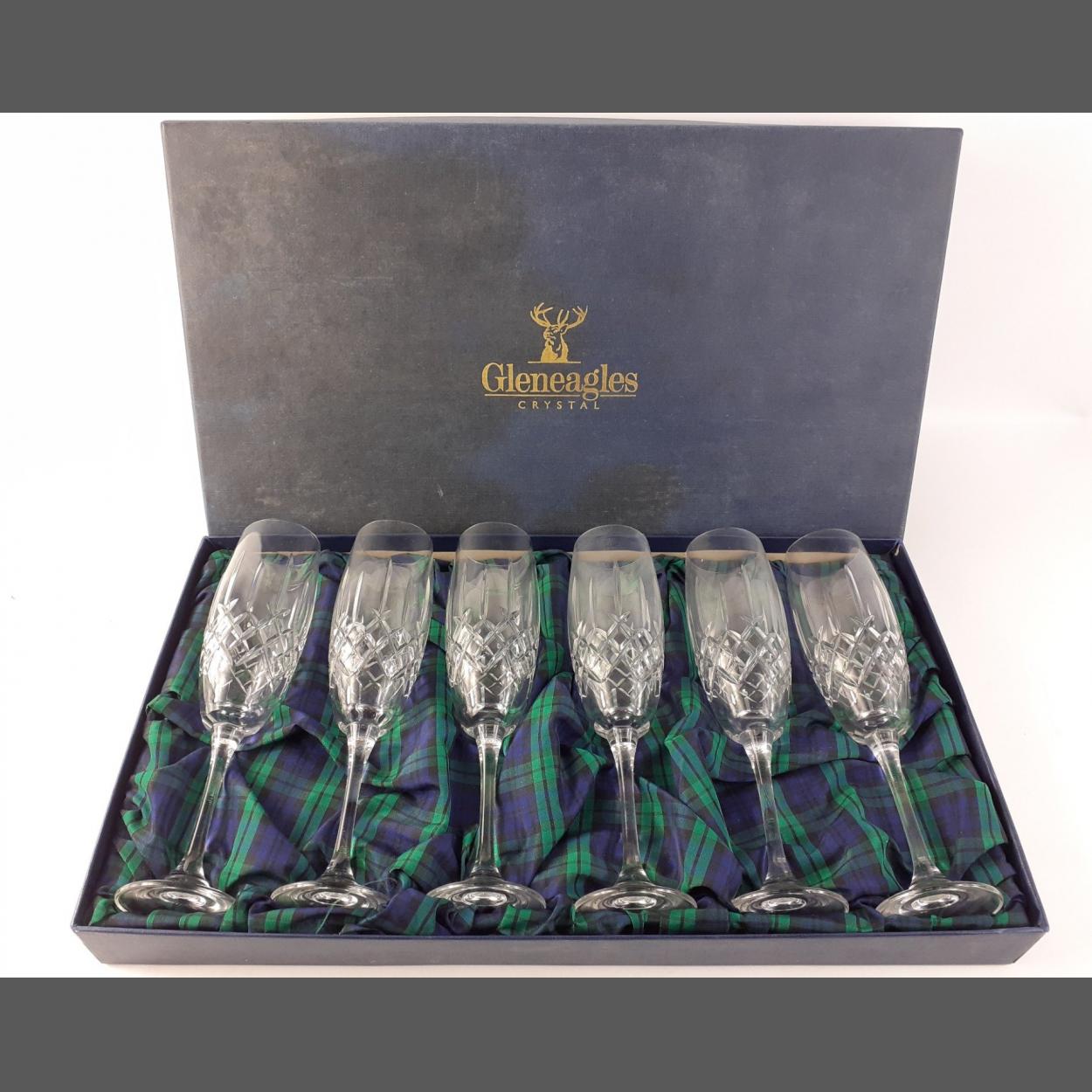 A presentation box of 6 GLENEAGLE crystal champagne flutes