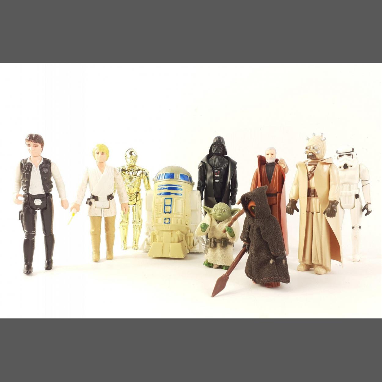 Collection of Star Wars figurines including Darth Vader, R2-D2, sand person, Luke Skywalker, Yoda and other