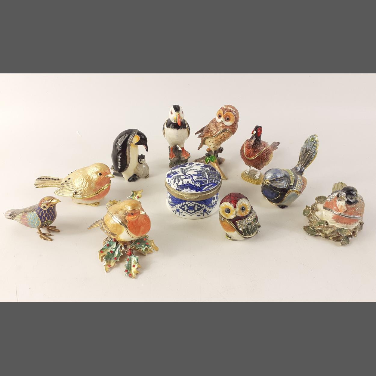 A collection of ARORA 2015 HIDDEN TREASURES birds including an owl, puffin, penguin, plus an ORCHID DESIGNS bluetit and robin as well as unnamed pheasant, robin, bluetit and owl and a charming cloisonne bird and a willow pattern pill box 6cm dia approx. Tallest bird approx 9cm high