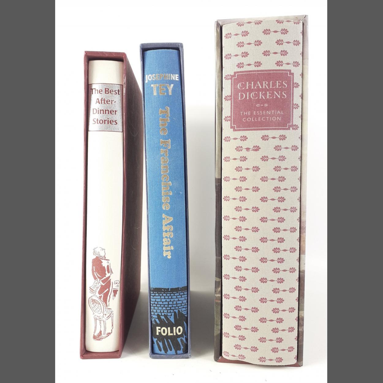 Two publications from the FOLIO SOCIETY - The Franchise Affair by Josephine Tey and The Best After-Dinner Stories selected by Tim Heald and also The Essential Collection by Charles Dickens published by KNICKERBOCKER CLASSICS. All presented in slipcases in unread condition