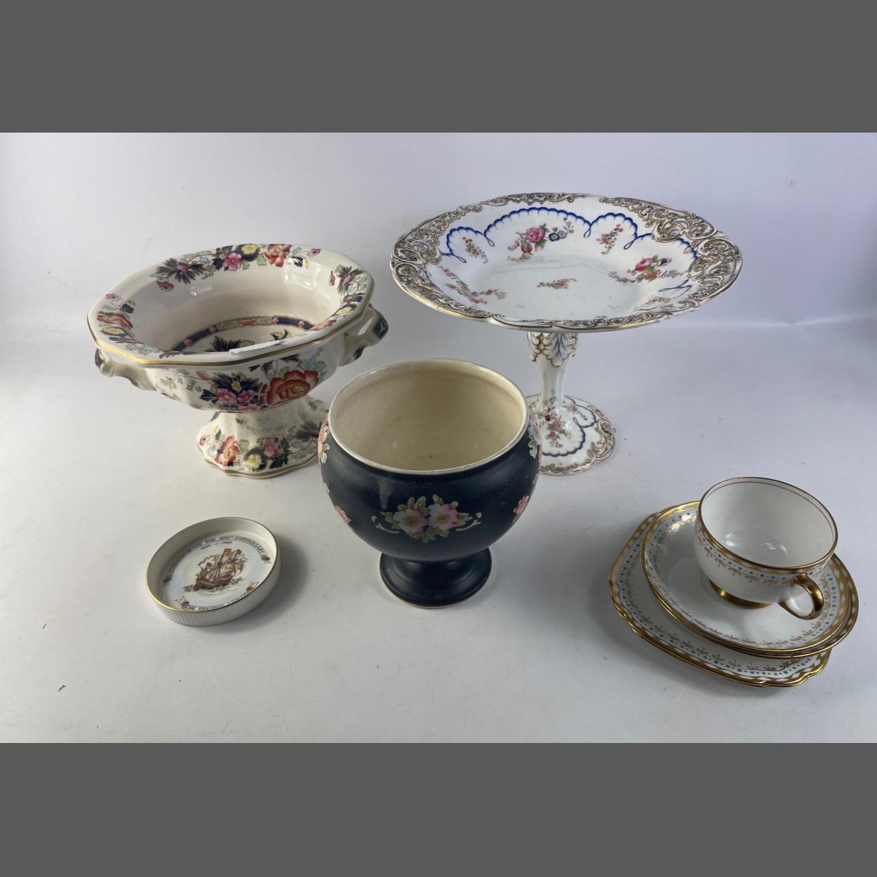 A mixed lot of ceramics to include a MASONS Ironstone raised bowl 6" height x 102 diameter , also a large COPELAND ceramic comporte 7.5" height x 10.5" diameter, also a black based DEVONWARE bowl 6" x 7.5", a part ROYAL ALBERT 1 cup, two saucer and two side plates , and lastly a commemorative 400th anniversary Armada small bowl by ROYAL DOULTON 4" diameter