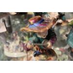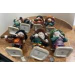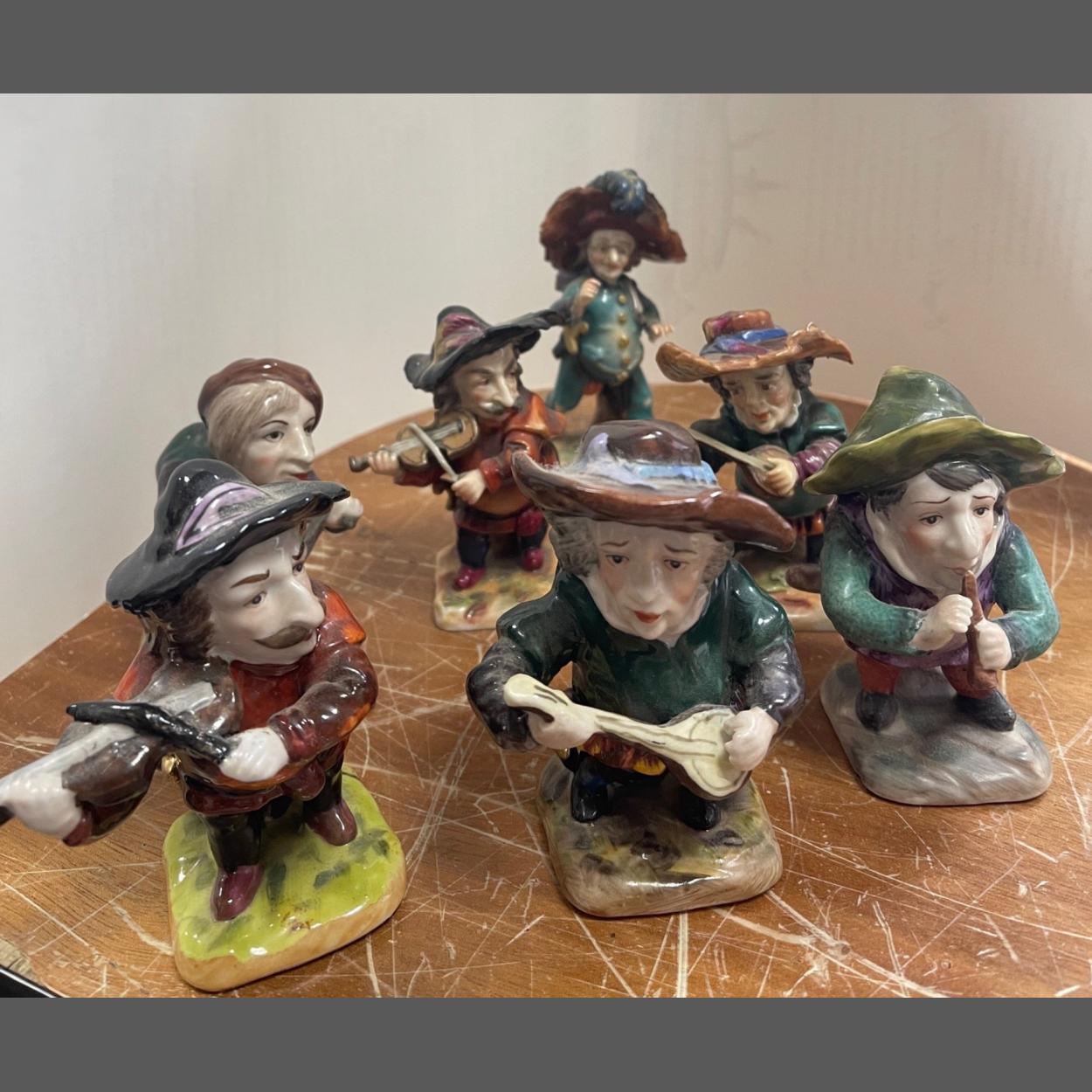 SIX vintage musical playing figurines by A J. Uffrecht & Co with a blue stamped crown over a capital N - and one other taller figure with a large brimmed feather hat (height11cm), and the six musical figurines the tallest height being 9.5cm approx. One of the musical figurines playing a mandolin has a tiny piece missing at the end of his instrument (see library pics) which is hardly noticeable