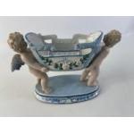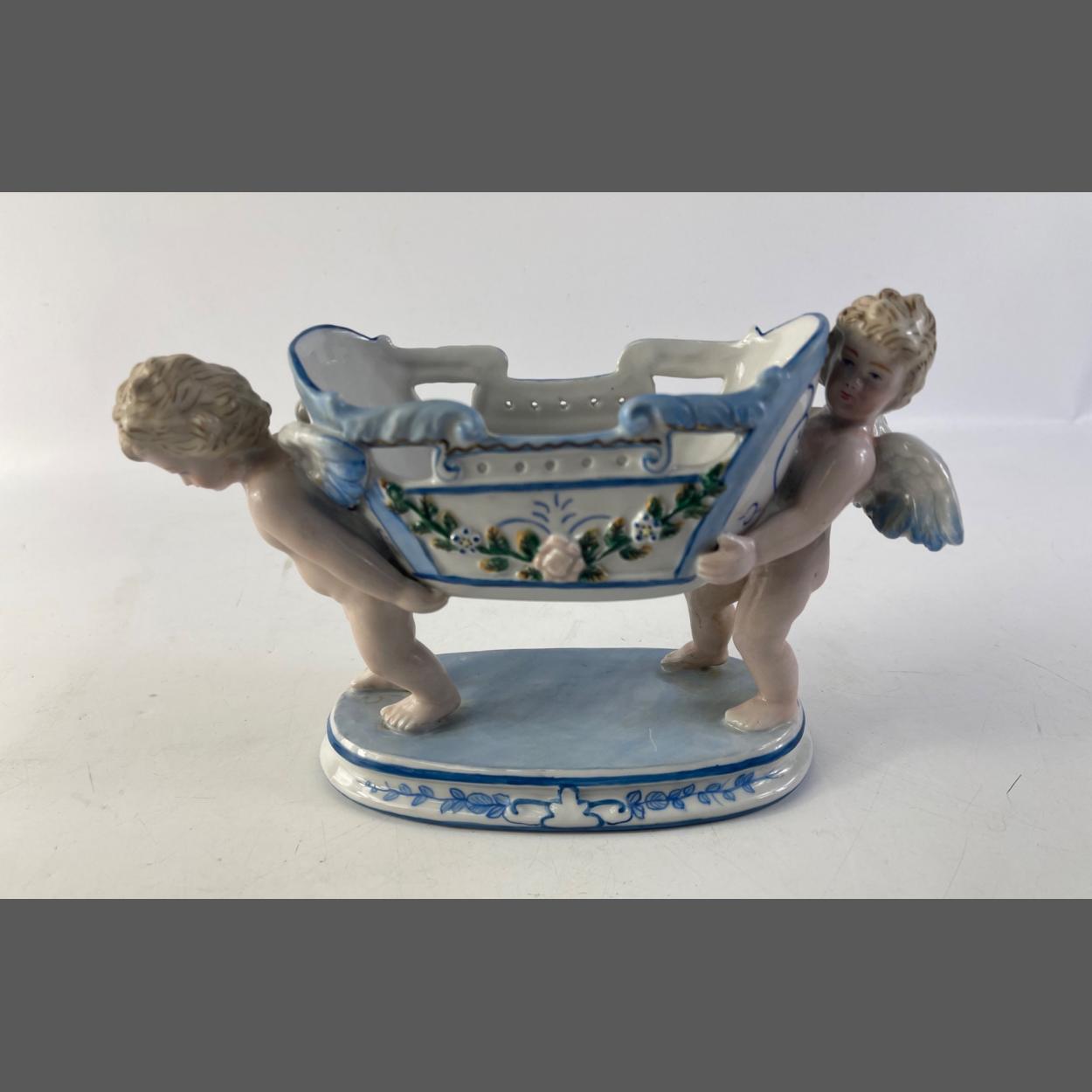 MEISSEN ornament with two cherubs carrying a bath tub adorned with flowers, stamped to base - dimensions 15cm height x 21cm width approx