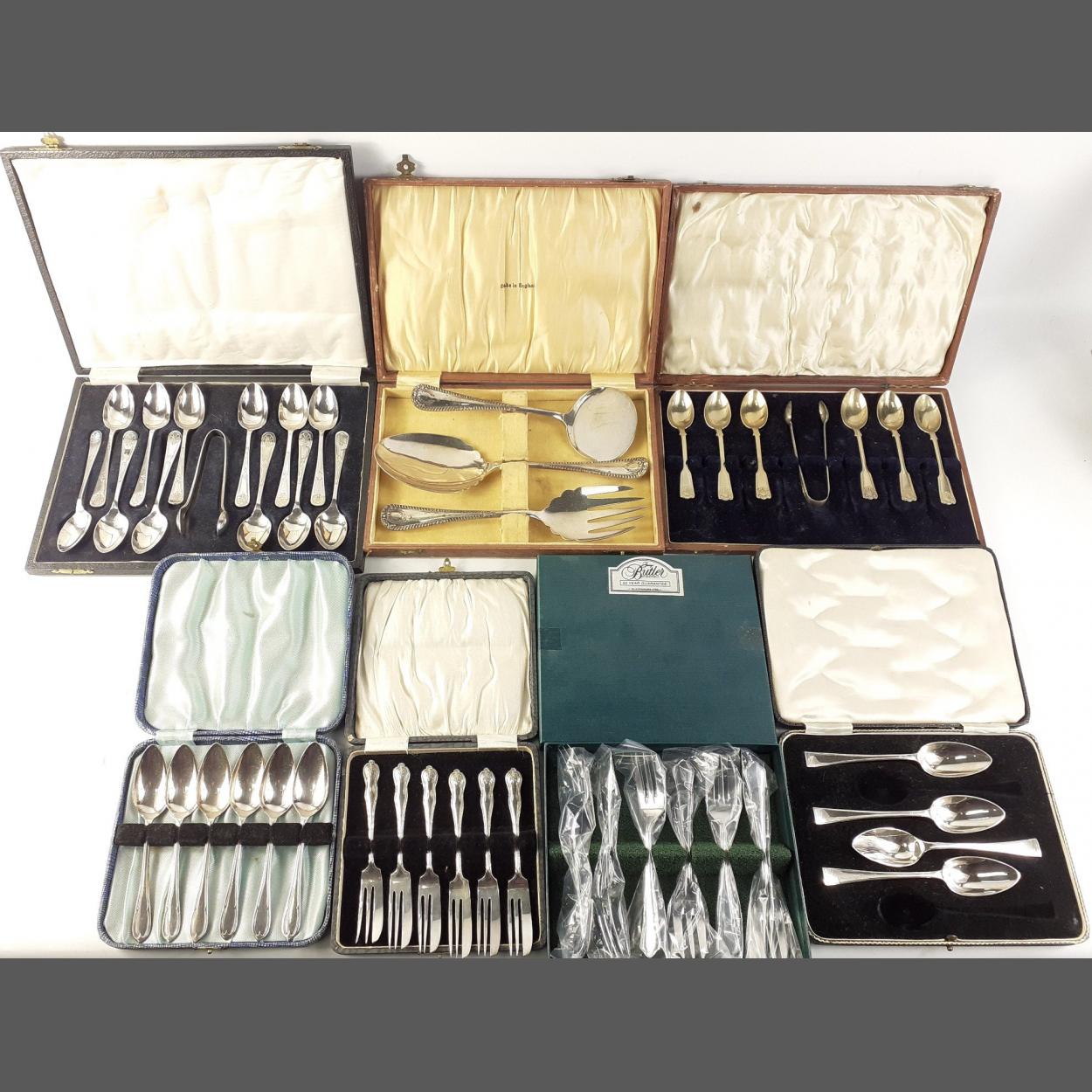 Seven boxed cutlery sets mainly EPNS including teaspoons with sugar snips, serving spoons, dessert forks, some items missing