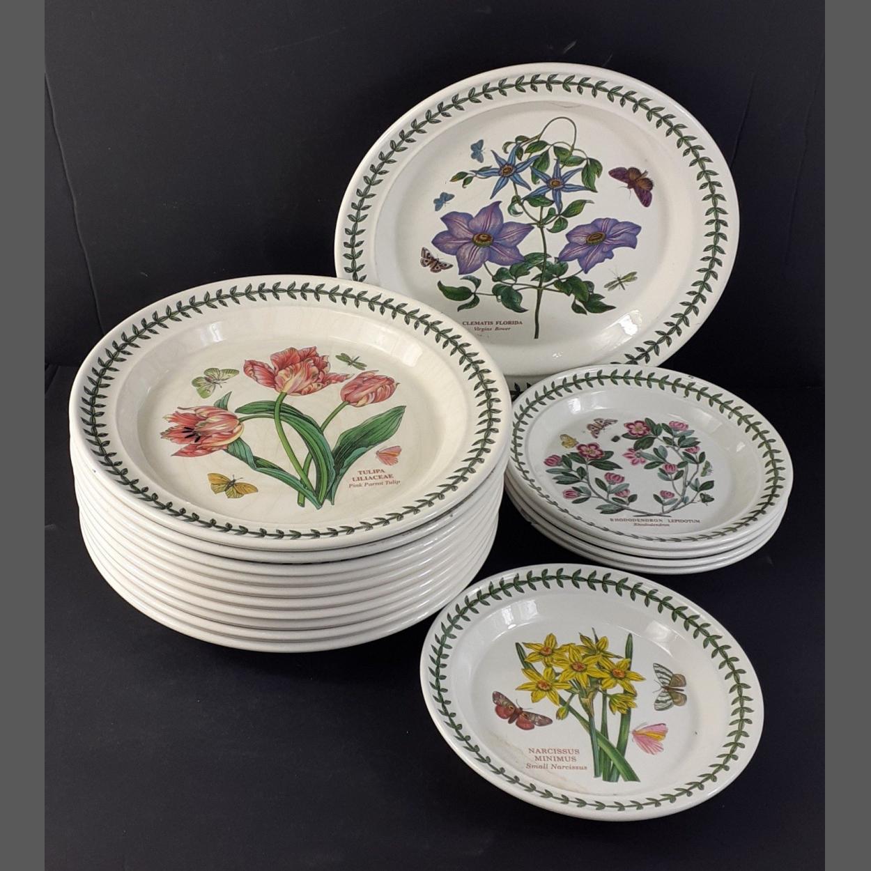 PORTMEIRION Ceramics - A collection of Botanic Gardens dinner and side plates. Eleven 27cm dinner plates and five 19cm side plates. Signs of useage and wear throughout.