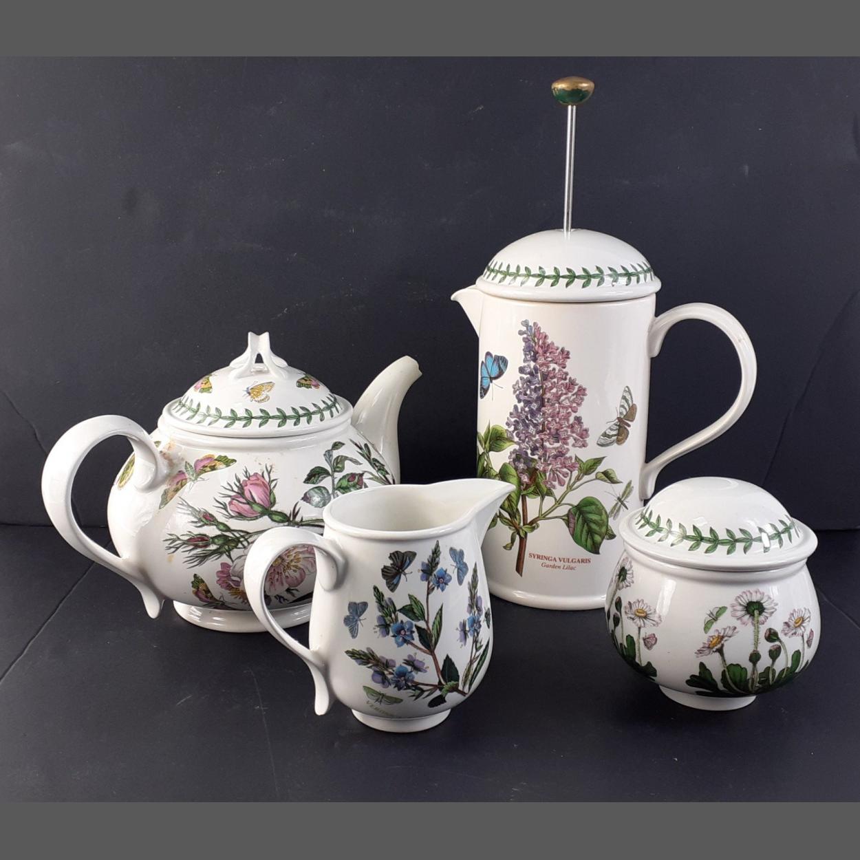 PORTMEIRION Ceramics - A collection of Botanic Gardens pattern tea ware to include teapot, coffee pot / cafetiere, sugar & cream. Various floral designs , coffee pot stands 23cm tall. Teapot has damage to spout and to handle, milk jug has a minor chip.
