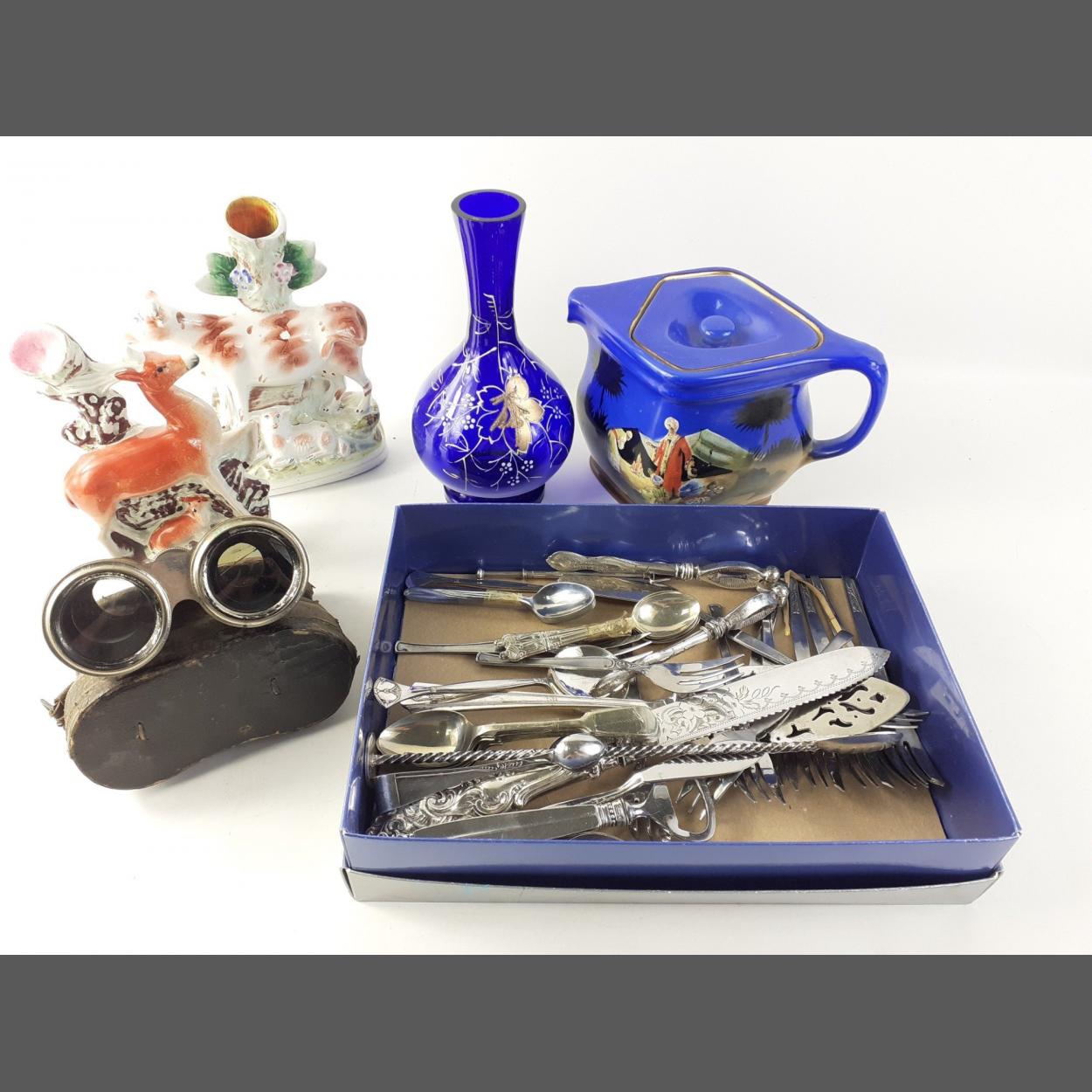 A mixed lot to include a RUBIAN ART POTTERY blue desert scenes diamond shaped teapot (13cm high), 2 flat backed mantel plaques with some damage, a blue glass vase 20cm tall, a pair of LE JOCKEY CLUB, Paris binoculars in case (poor condition case), and a box of mixed cutlery much of it EPNS