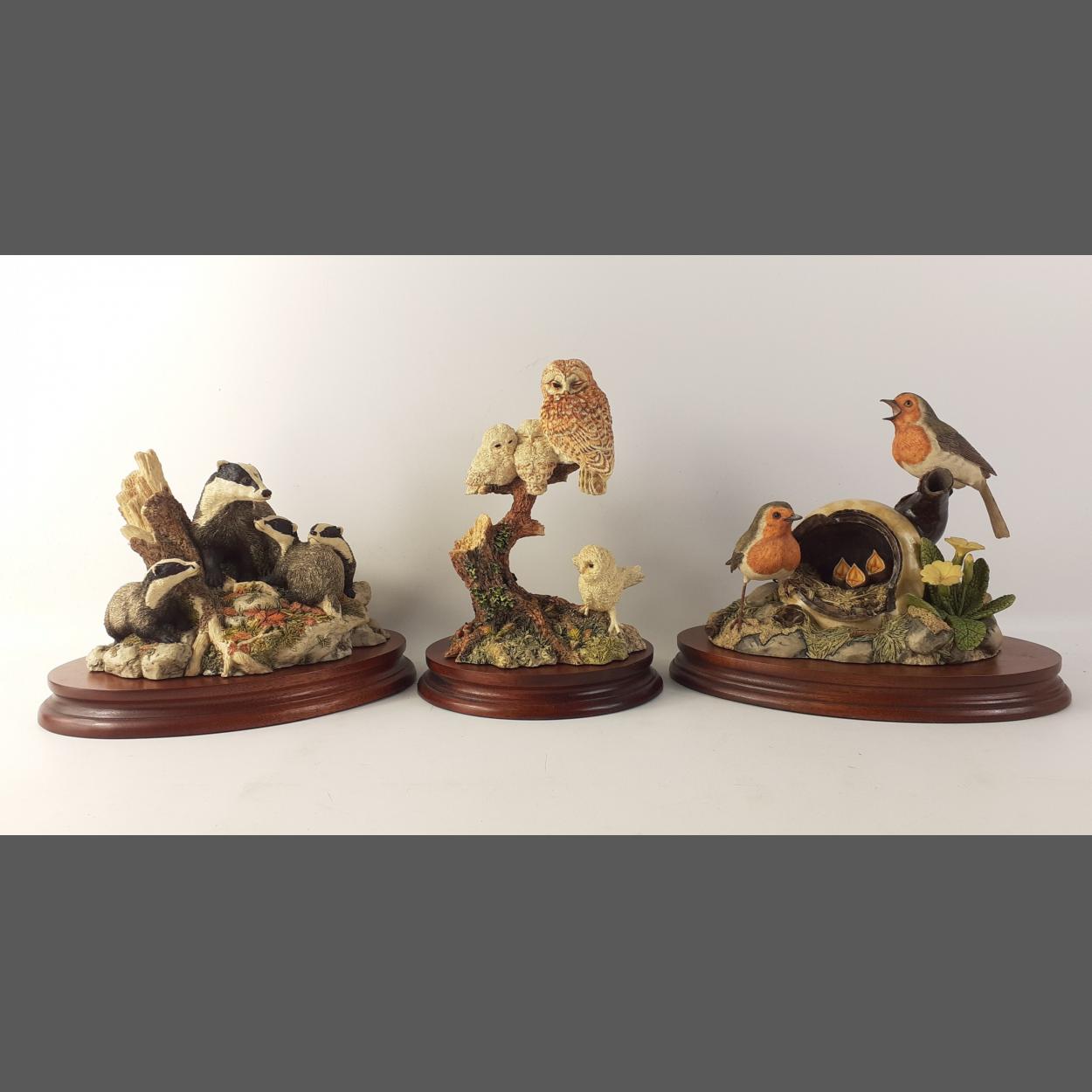 A BORDER FINE ARTS figurine 'The Joys of Spring (SOC2) on a wooden plinth approx 19cm high 1990, 'Evening Shadows (SOC7) on plinth approx 16cmHx 20cmL and 'A Watchful Eye' (SOC8) on plinth21cmH x 15cm dia approx. One tiny chip on base of badger figurine