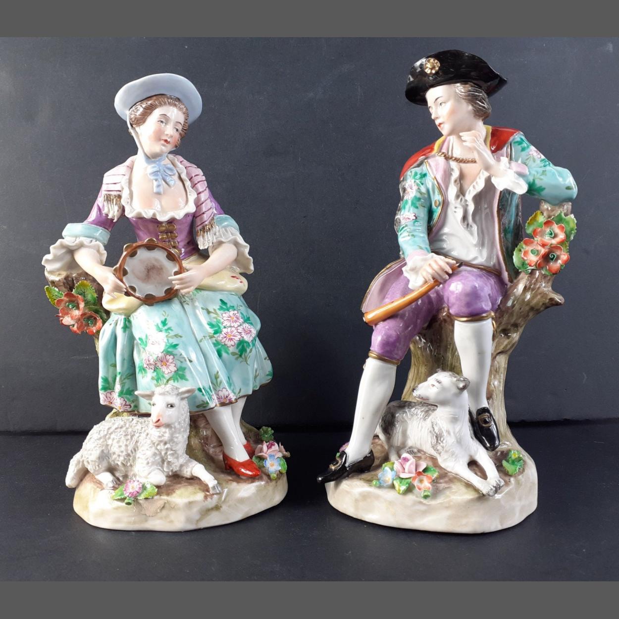 Two SITZENDORF figures of a young lady and gent with sheep and dog. Both in good condition with no loss to extremeties. Each standing 19cm tall approx.