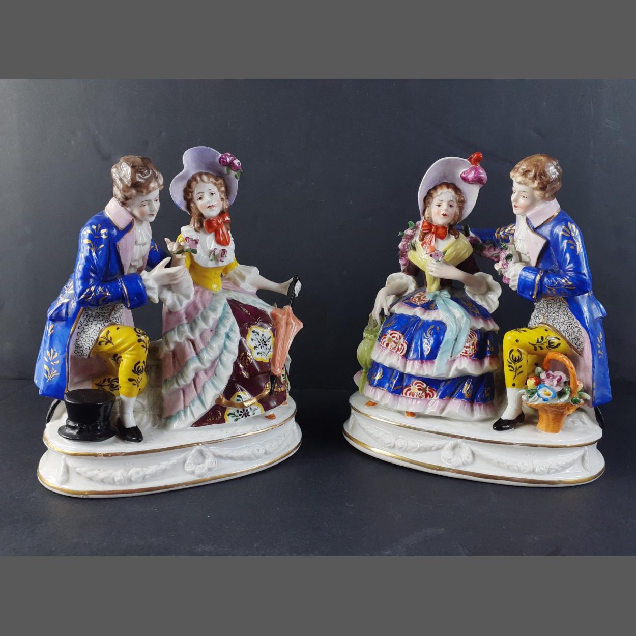 Two gold anchor marked CHELSEA figures groups of a courting couple Each standing 17cm tall and in good condition with no damage noted.