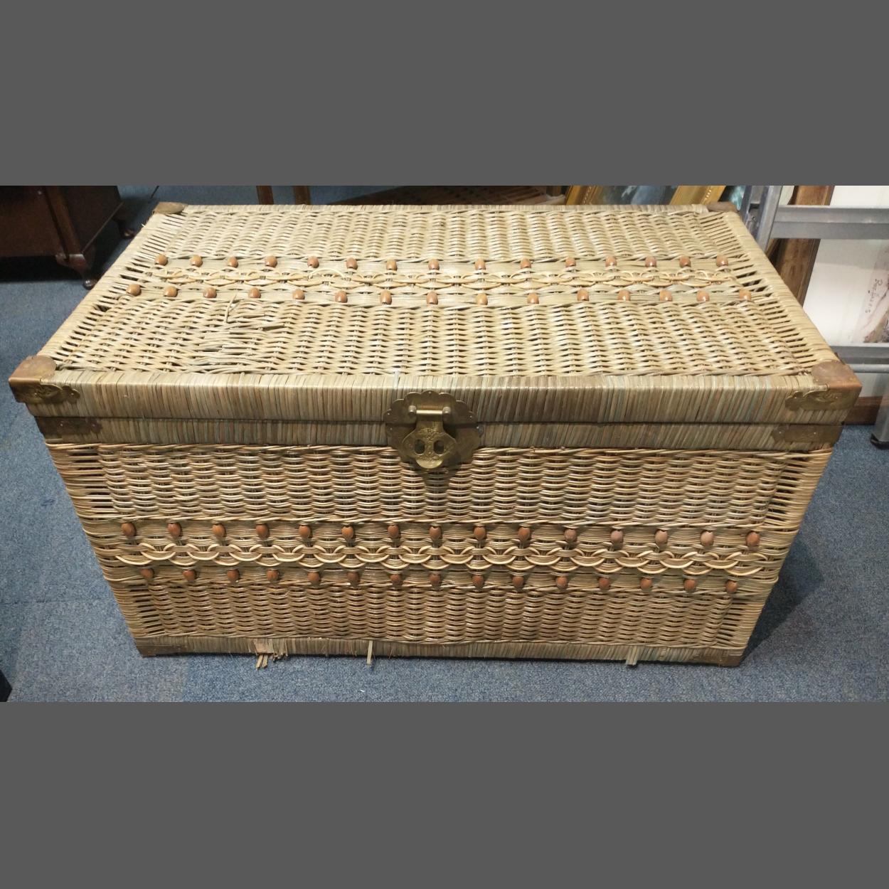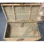 A large whicker travel trunk with brass bound corners and lovely ettched edges and carry plates. Measurements 92 cm wide 52cm high and 51cm deep. In lovely useable condition.