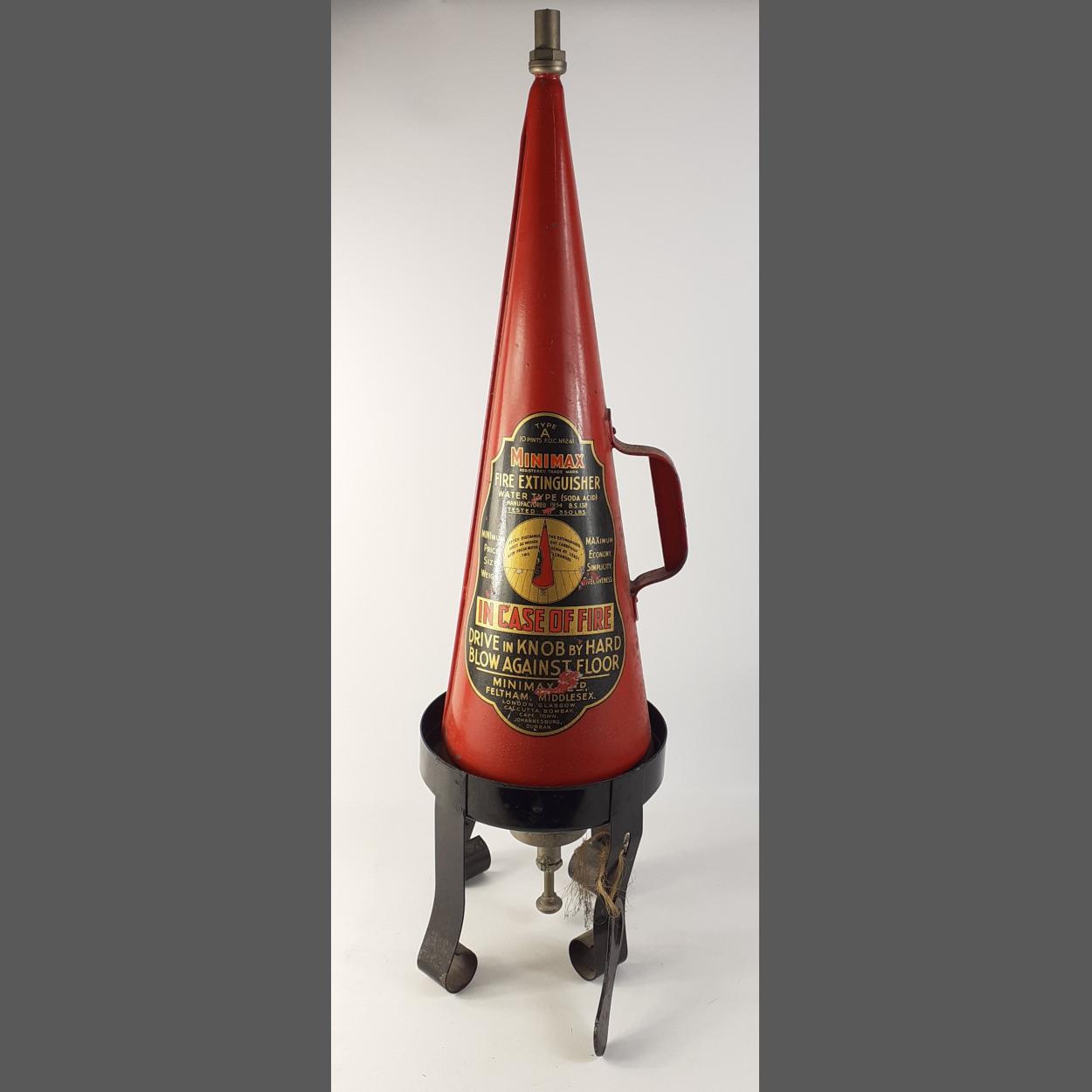 A vintage Minimax triangular FIRE EXTINGUISHER on floor stand with spanner. Standing 80cm tall approx and in nice vintage condition.
