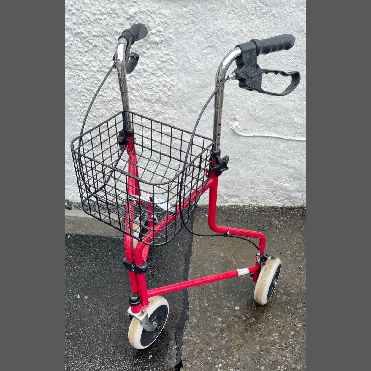 A very useful folding disability walking aid trike with shopping basket and dual brakes for added stability. Stands 90cm tall.