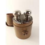 A pair of glass hip flasks in a cylindrical leather case, initialled C. D., each with white metal tops, case stands 15cm high