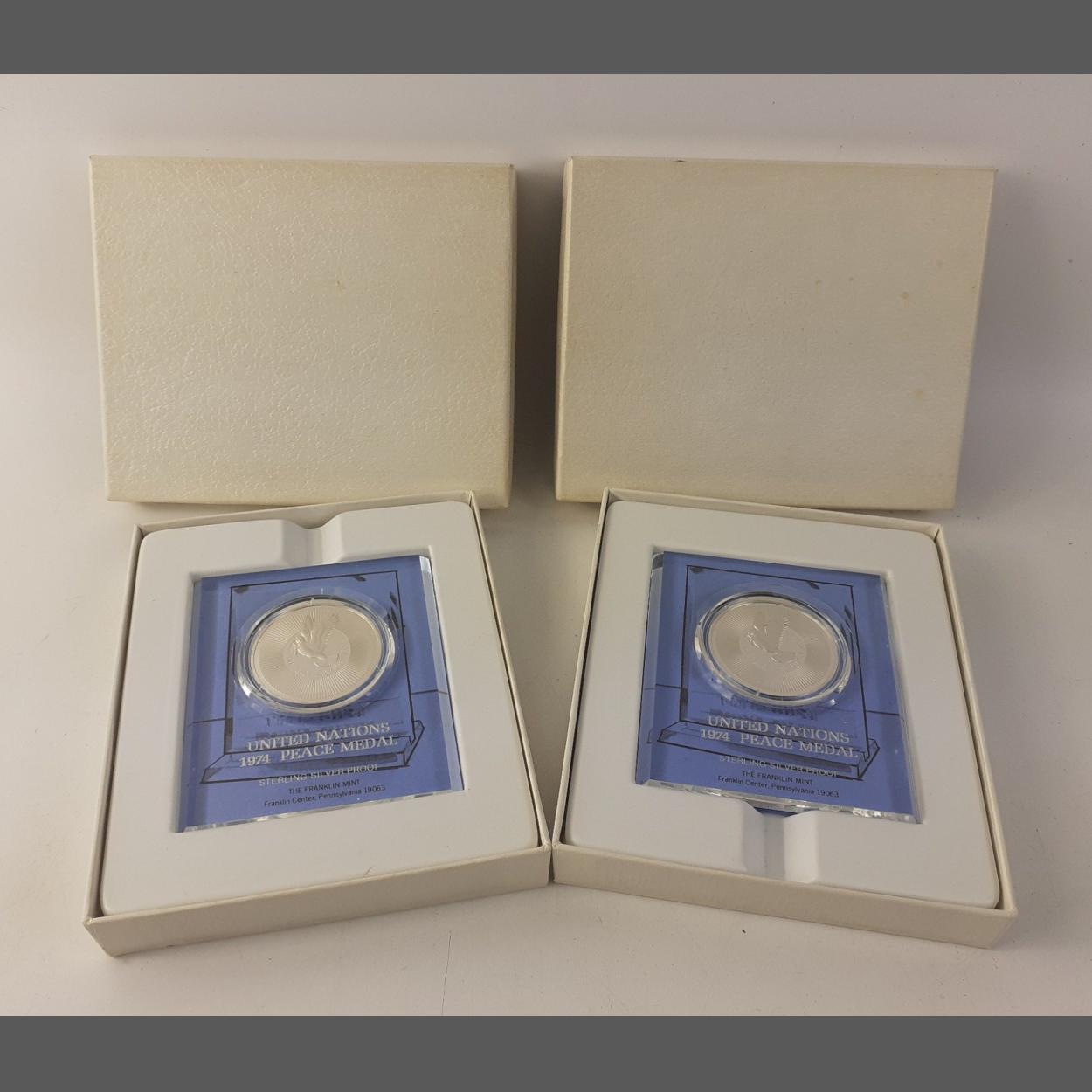 Two UNITED NATIONS 1974 PEACE MEDALS. Franklin Mint issued complete in boxes with perspex holders with stands and paperwork. Beautifully sculpted medals in Sterling Proof Silver. 40mm approx and each weighing 24.9g