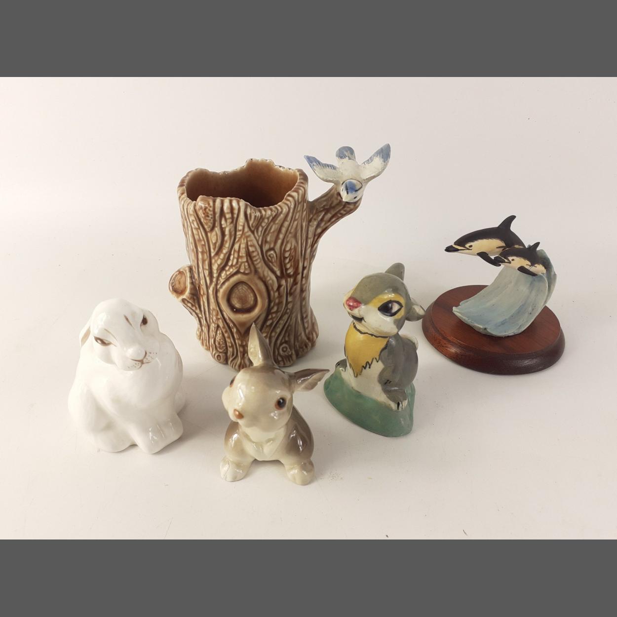For the LOVERS of cute CERAMIC ANIMALS! A delightful collection of 5 pieces to include a COALPORT Bone China white rabbit measuring approx. 7cm in height, a "Made in U.S.A." brown rabbit (slight damage to right back foot) measuring a dinky 6cm in height, a Disney-style rabbit (with slight hairline crack) measuring approx. 7cm in height, a WADE porcelain tree trunk with bluebird perched on branch approx. 10cm in height and a BORDER FINE ARTS WW22 "Dolphin & young" sculpture on round wooden plinth measuring approx. 7cm in height.